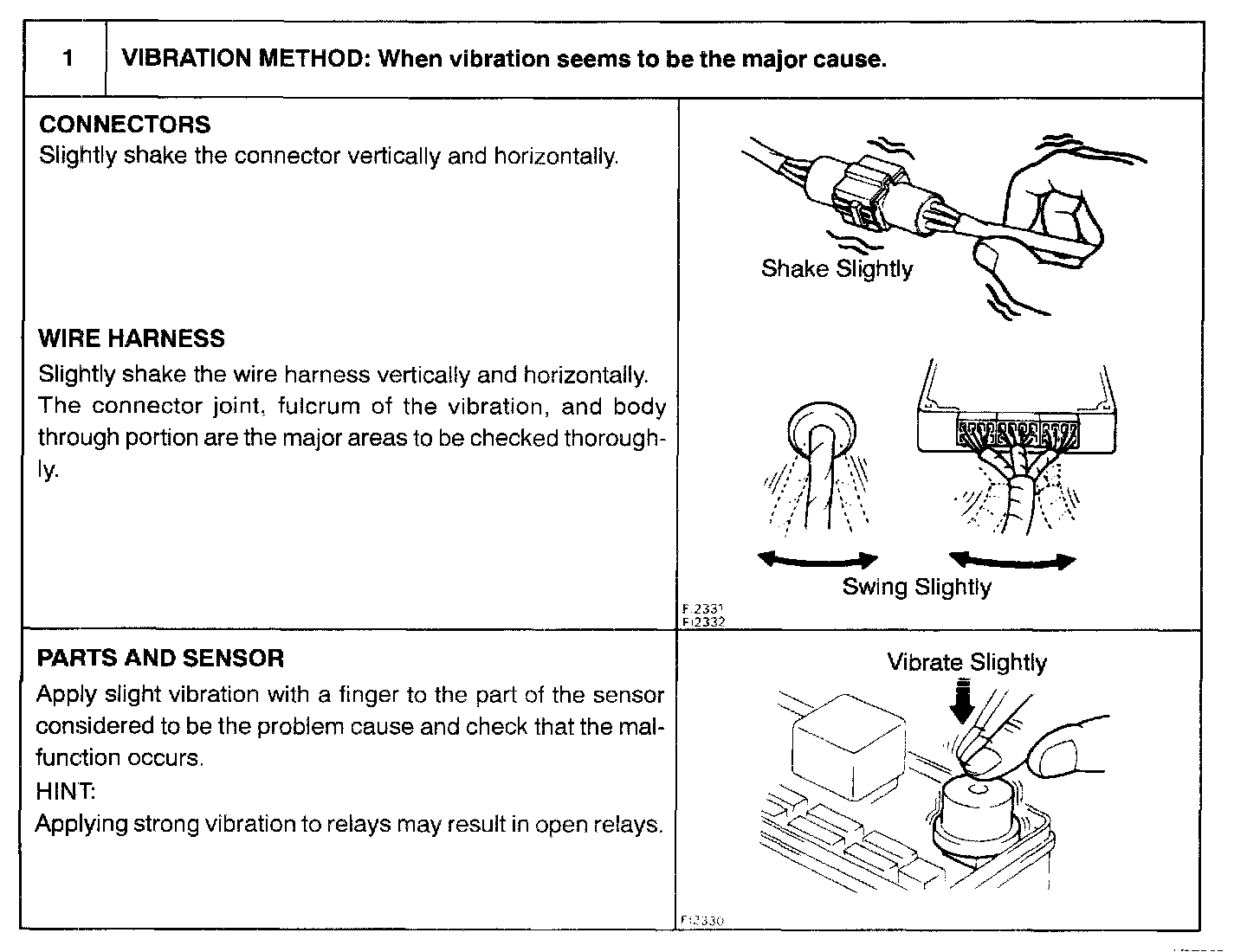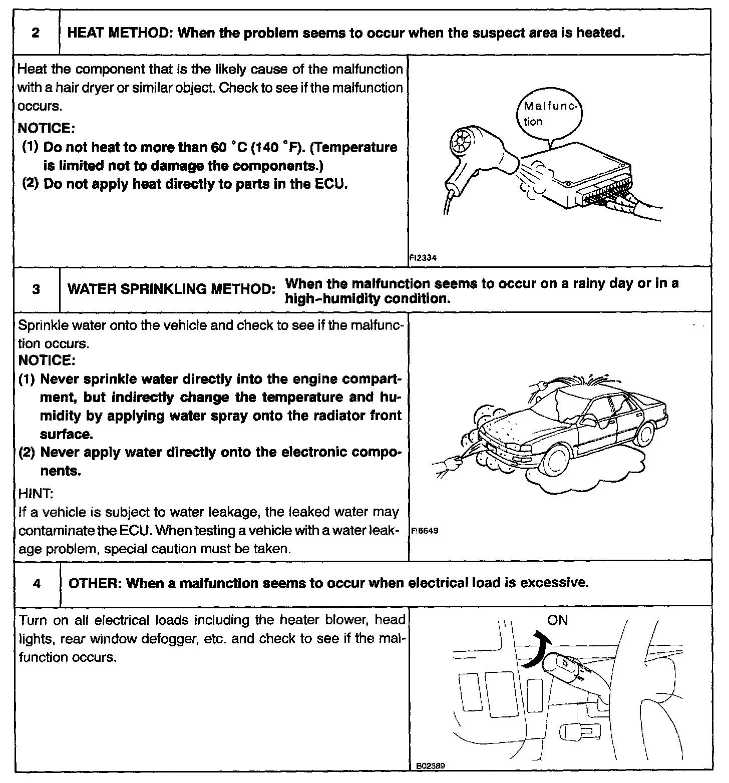 The most difficult case in troubleshooting is when there are no problem symptoms occurring. In such cases, a thorough customer problem analysis must be carried out, then simulate the same or similar conditions and environment in which the problem occurred in the customer's vehicle. No matter how much experience a technician has, or how skilled he may be, if he proceeds to troubleshoot without confirming the problem symptoms he will tend to overlook something important in the repair operation and make a wrong guess somewhere, which will only lead to a standstill. For example, for a problem which only occurs when the engine is cold, or for a problem which occurs due to vibration caused by the road during driving, etc., the problem can never be determined so long as the symptoms are confirmed with the engine hot condition or the vehicle at a standstill. Since vibration, heat or water penetration (moisture) is likely cause for problem which is difficult to reproduce, the symptom simulation tests introduced here are effective measures in that the external causes are applied to the vehicle in a stopped condition.