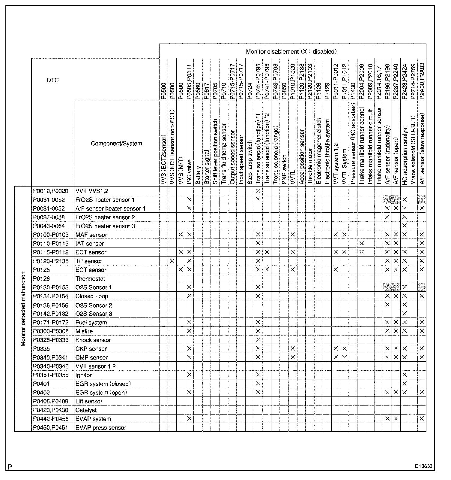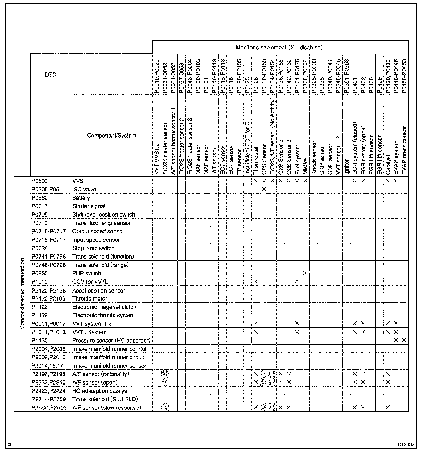 THE MONITOR WILL RUN WHENEVER THE FOLLOWING DTCS ARE NOT PRESENT (MONITOR DISABLEMENT LIST)HINT: This table indicates ECM monitoring status for the items in the upper columns if the DTCs in each line on the left are being set.