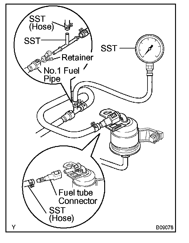 f. Install SST (pressure gauge) as shown in the illustration by using SST and fuel tube connector.