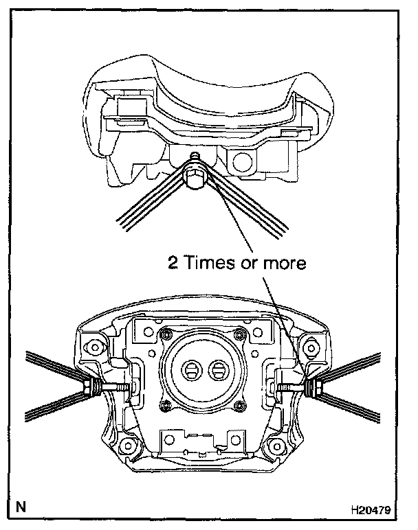 CAUTION: If a wire harness which is too thin or some other thing is used to tie down the steering wheel pad, it may be snapped by the shock when the airbag is deployed. This is highly dangerous. Always use a wire harness for vehicle use which is at least 1.25 sq.mm (0.0019 sq.in).