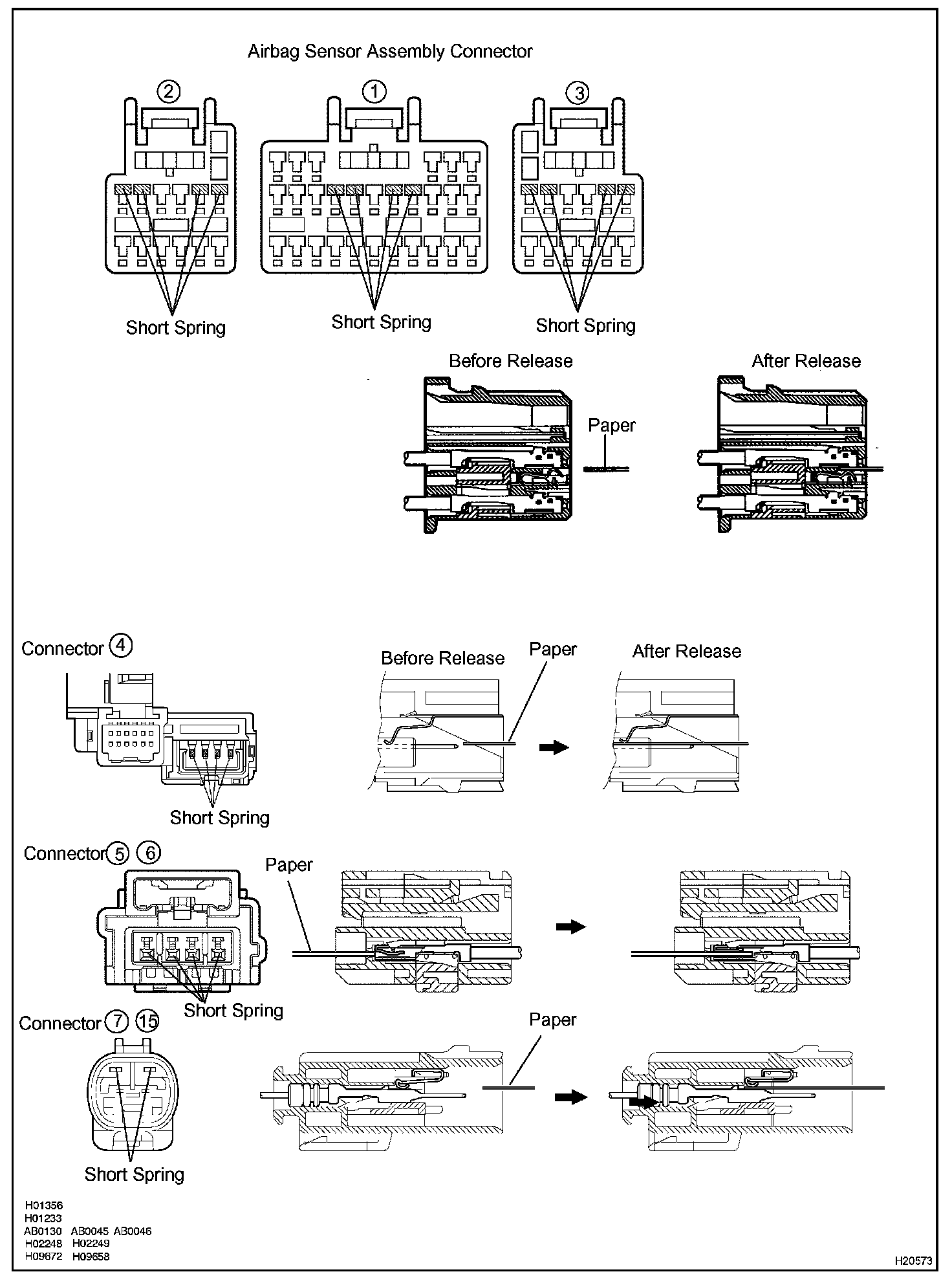 When release of the airbag activation prevention mechanism is directed in the troubleshooting procedure, as shown in the illustration of the connectors, insert paper which has the same thickness as the male terminal between the terminal and the short spring.