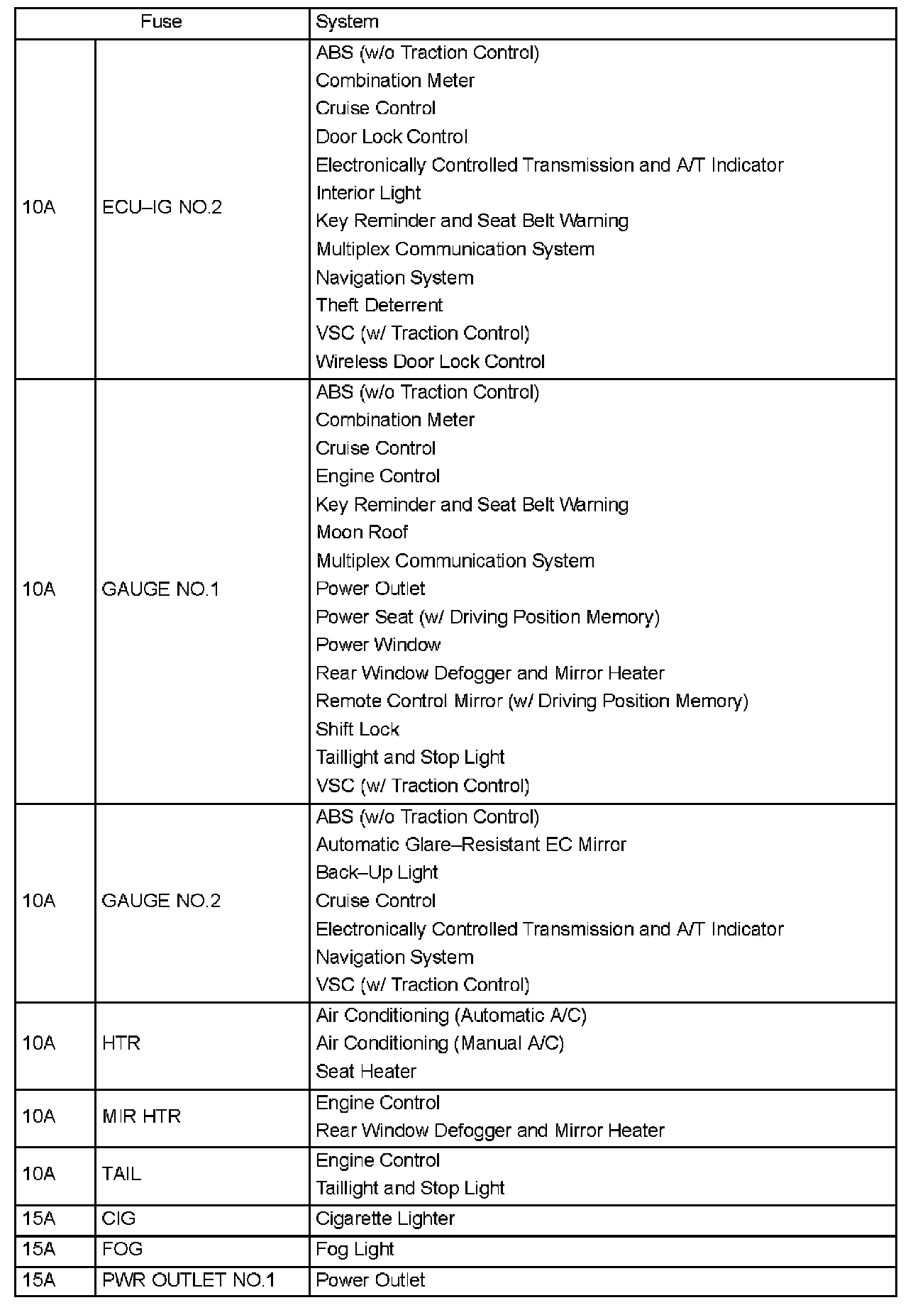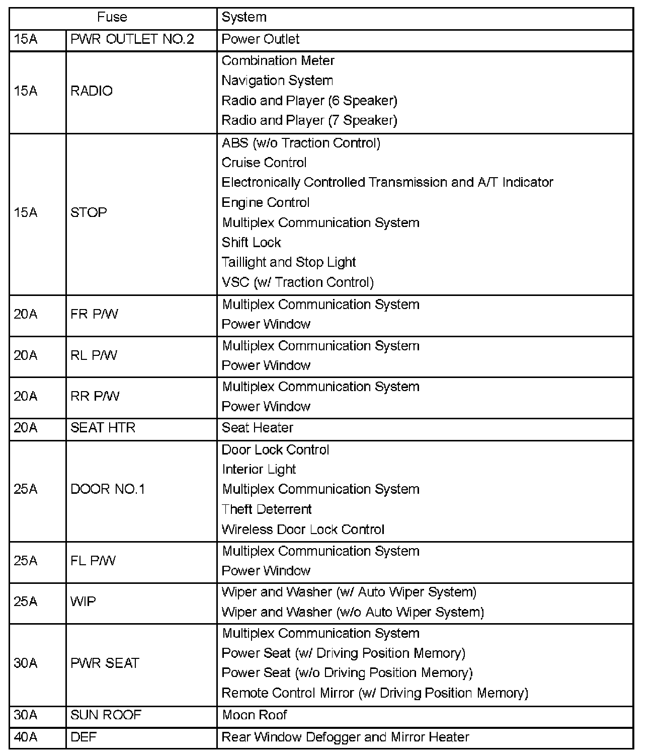Interior Panel Fuse Identification