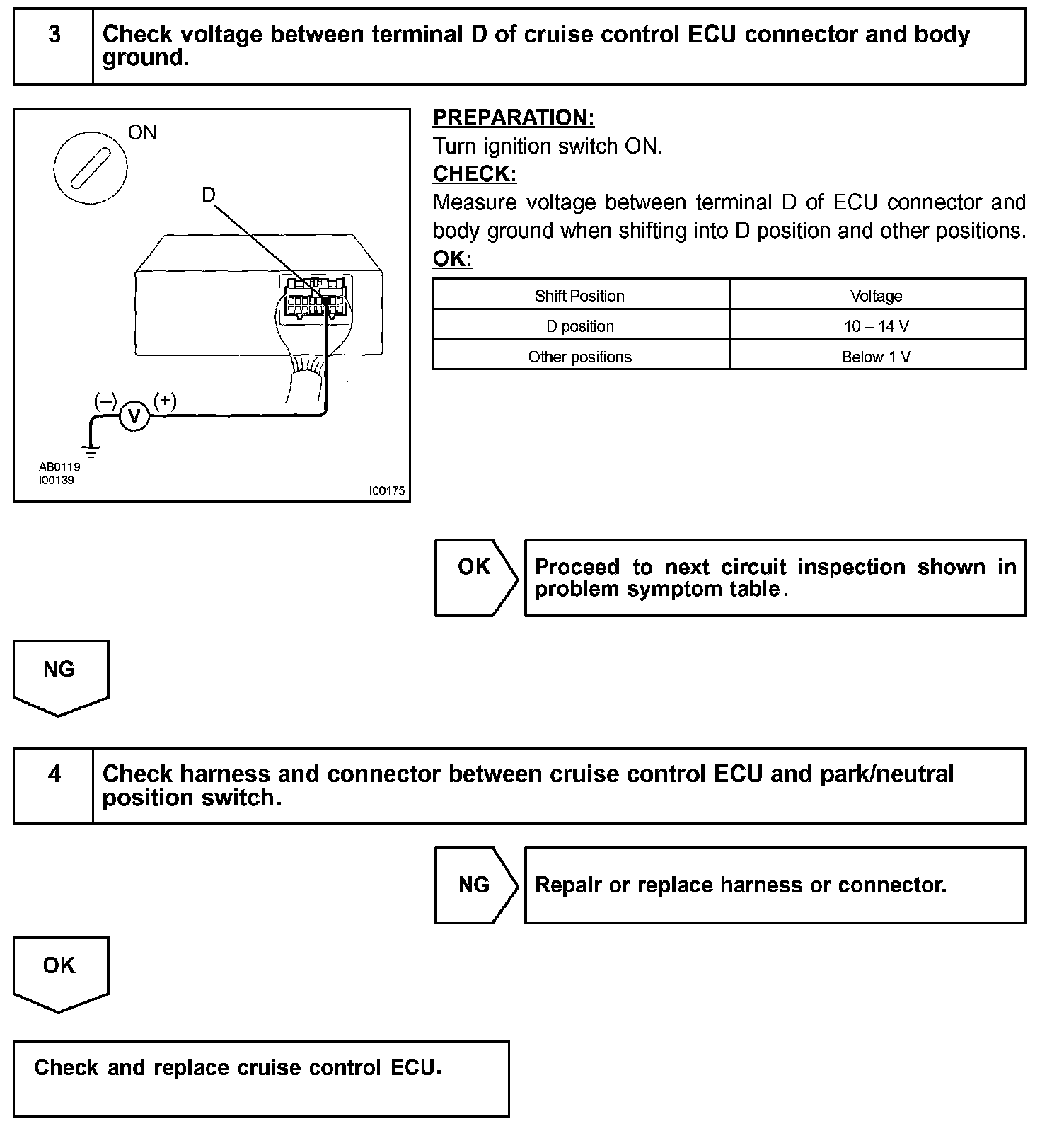 CIRCUIT DESCRIPTIONWhen the shift position is except D, a signal is sent from the park/neutral position switch to the ECU. When this signal is input during cruise control driving, the ECU cancels the cruise control.