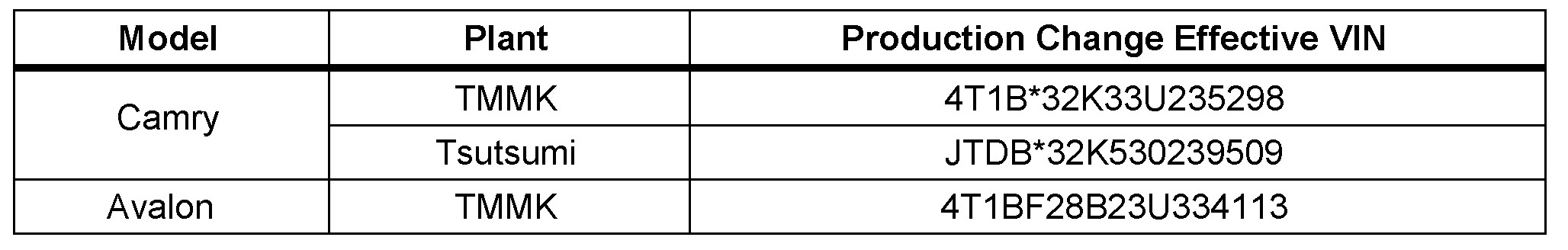 - 2003 model year Avalon and Camry vehicles produced BEFORE the following VINs were built with the previous bolt/nut; vehicles AFTER the following VINs were built with the new bolt/nut.
