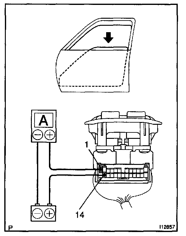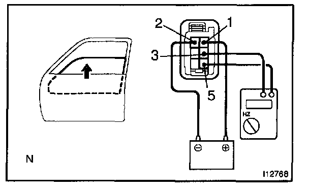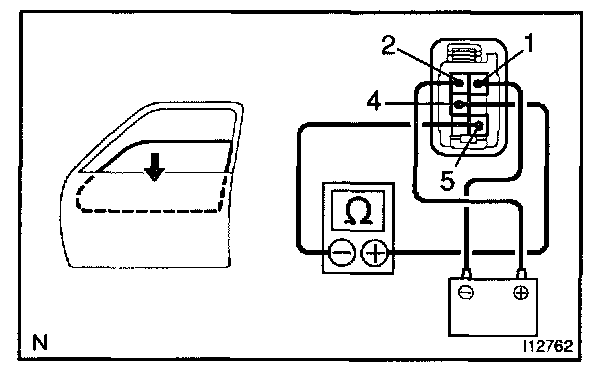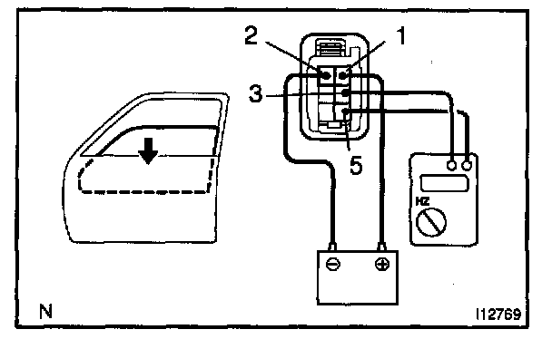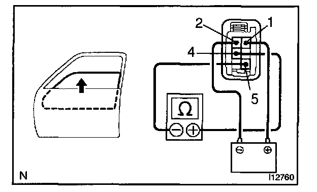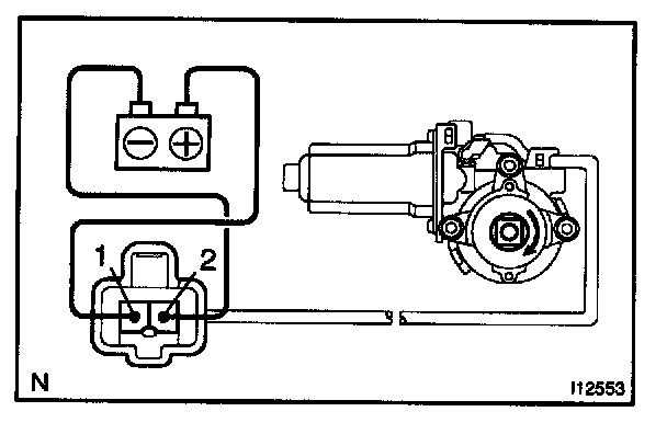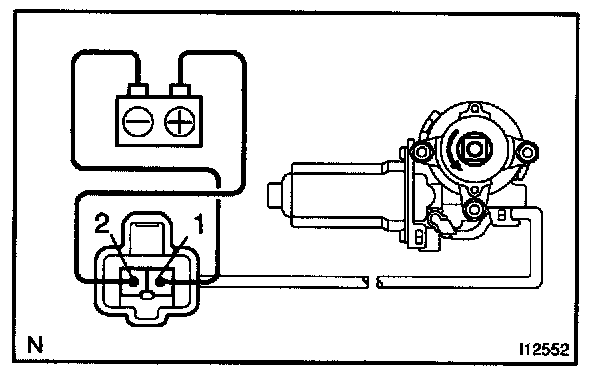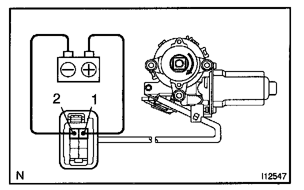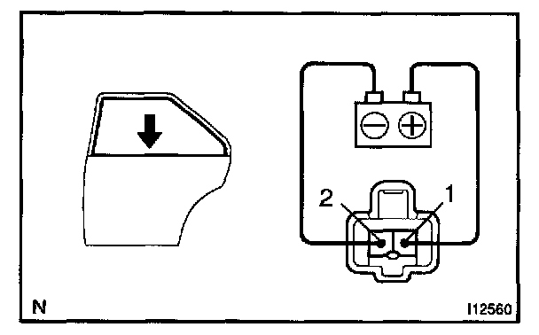 f. Approximately 60 seconds later, connect the positive (+) lead from the battery to terminal 2 and negative (-) lead to terminal 1, and check that the window begins to descended.