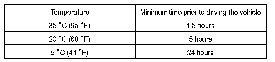 NOTE: Take care not to drive the vehicle during the time described in the table.