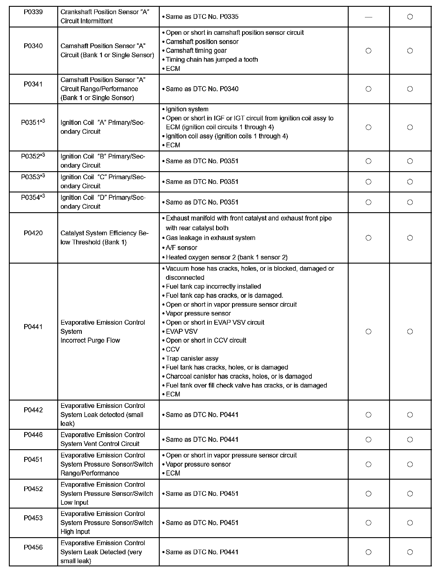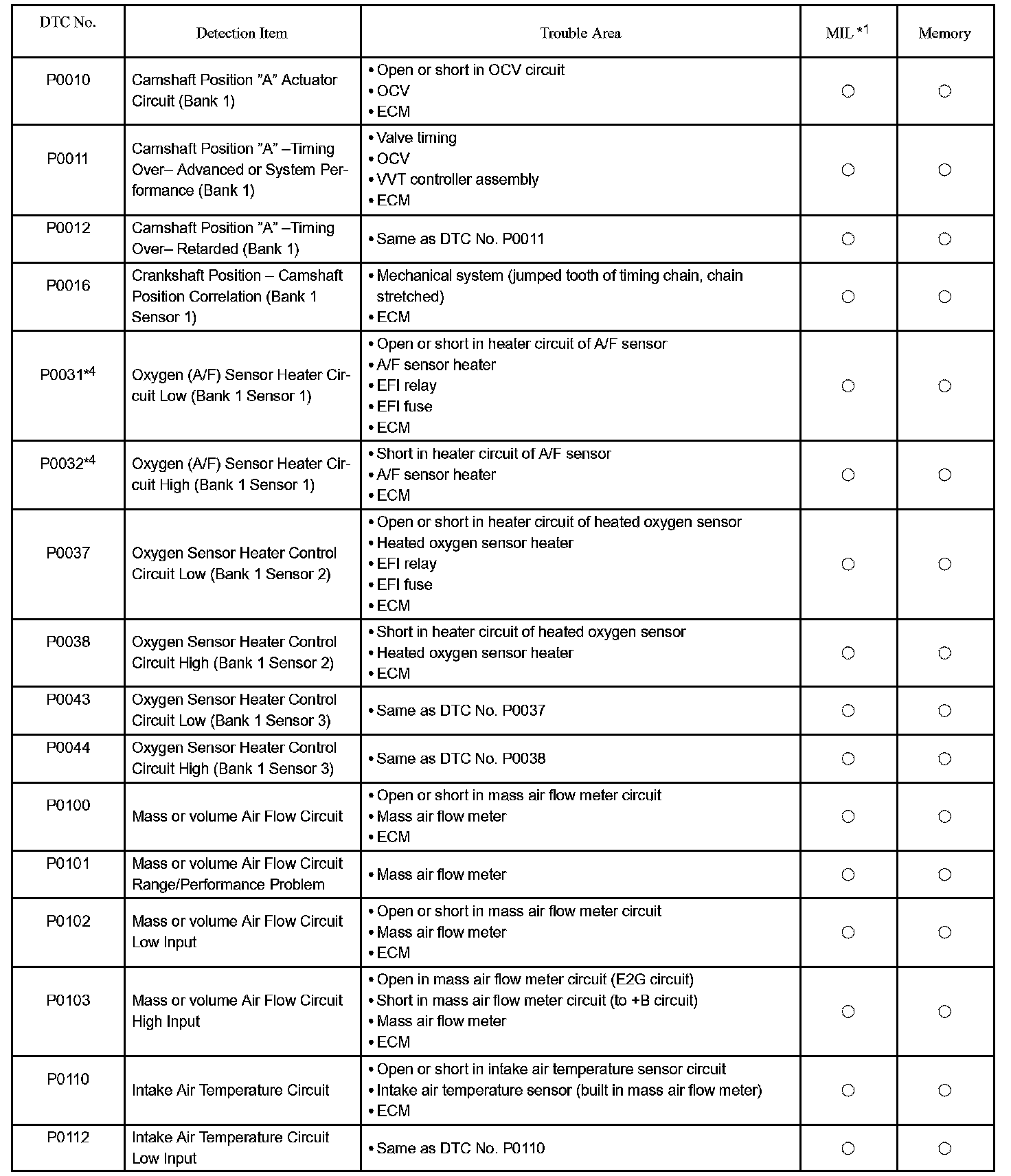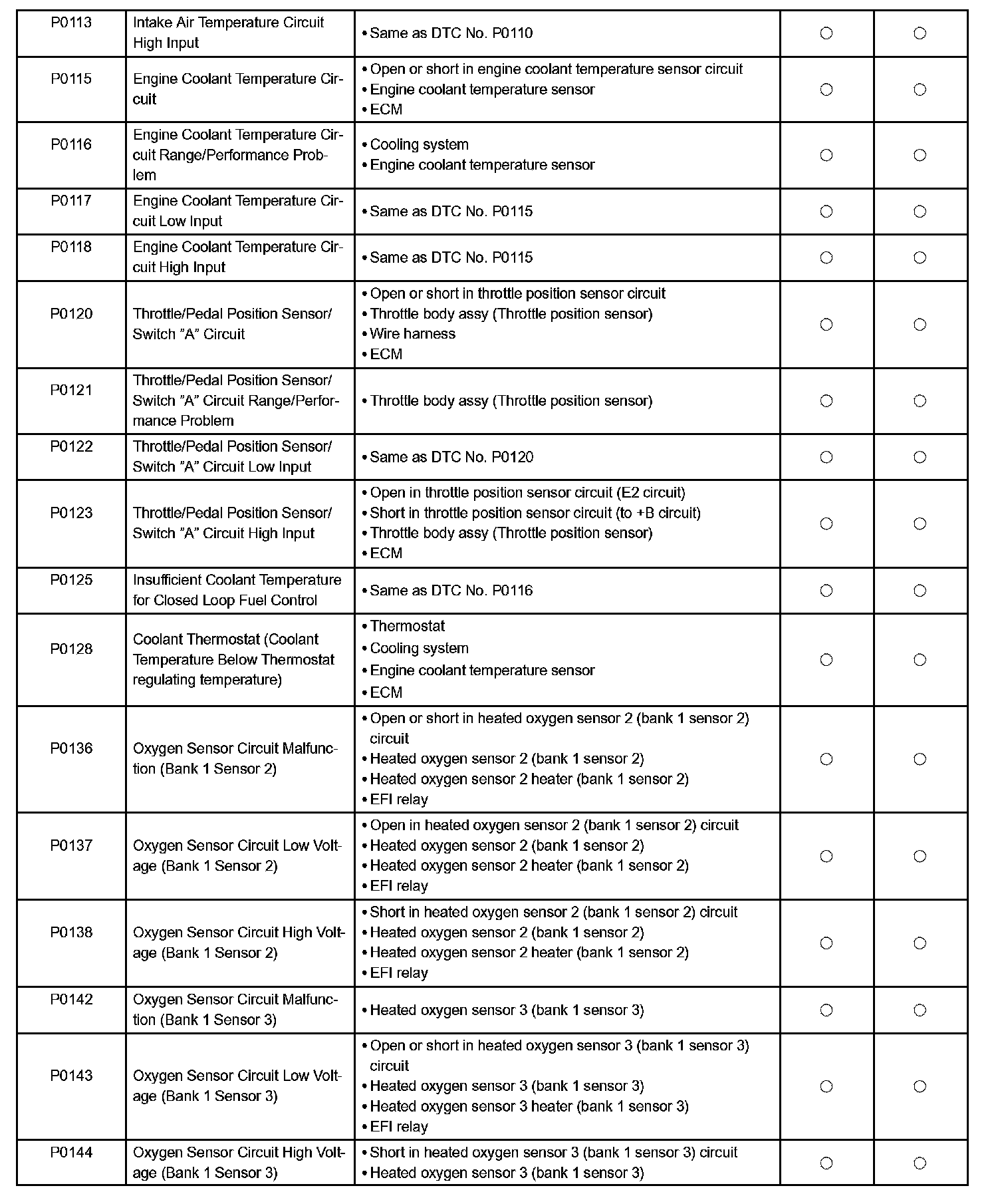 HINT: Parameters listed in the chart may be different than your readings depending on the type of instrument used and other factors. During the DTC check, refer to the table if a malfunction code is displayed. For details about each code, refer to the DTC chart's.