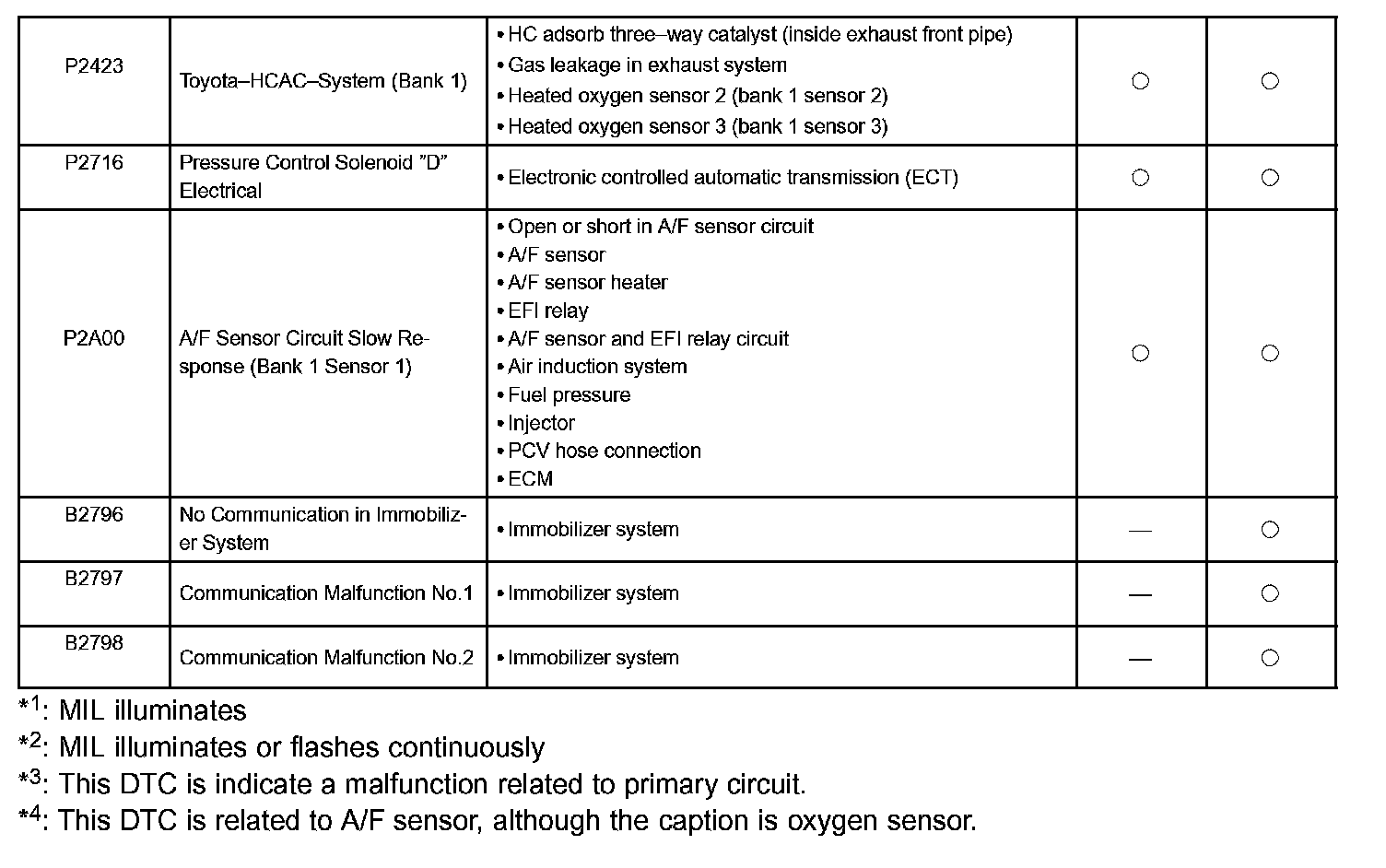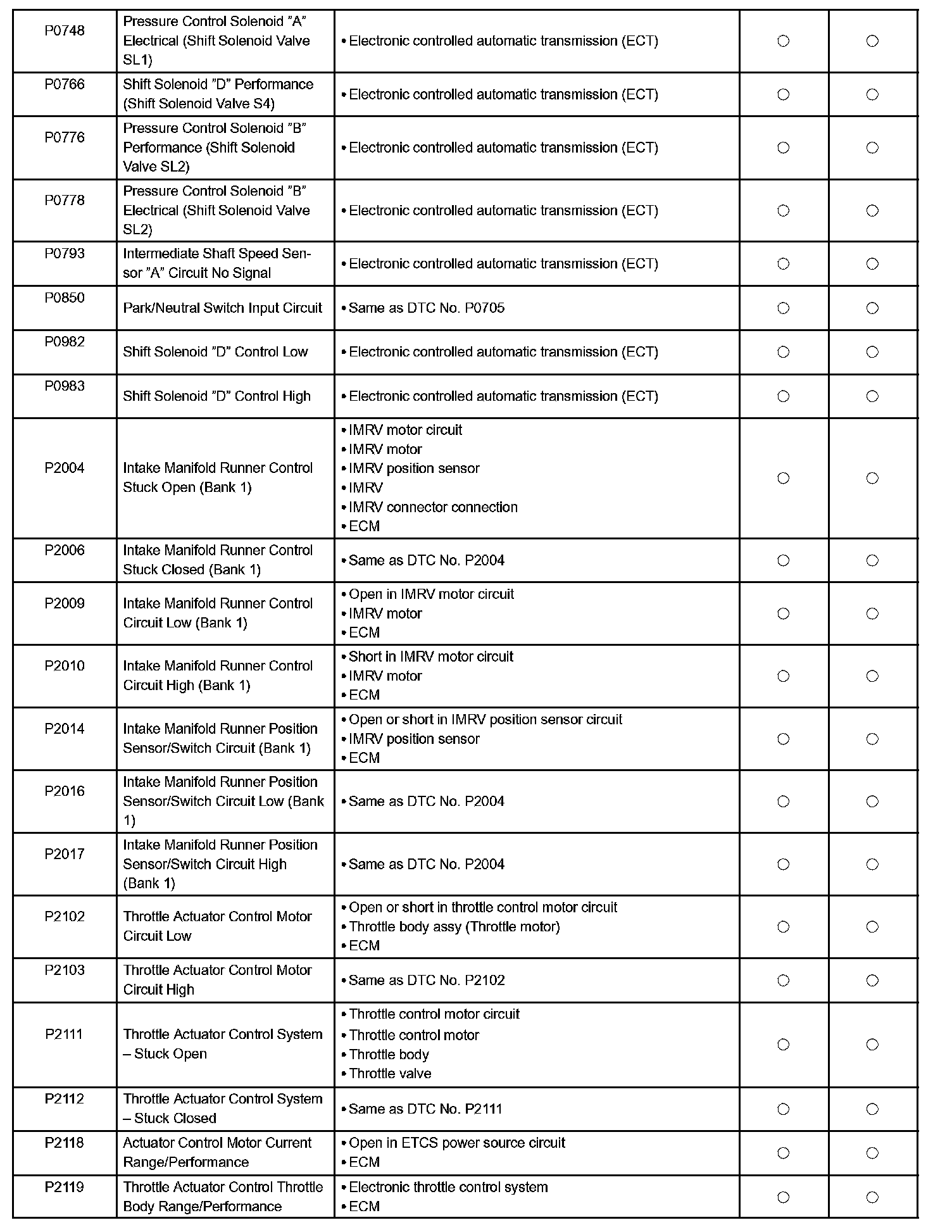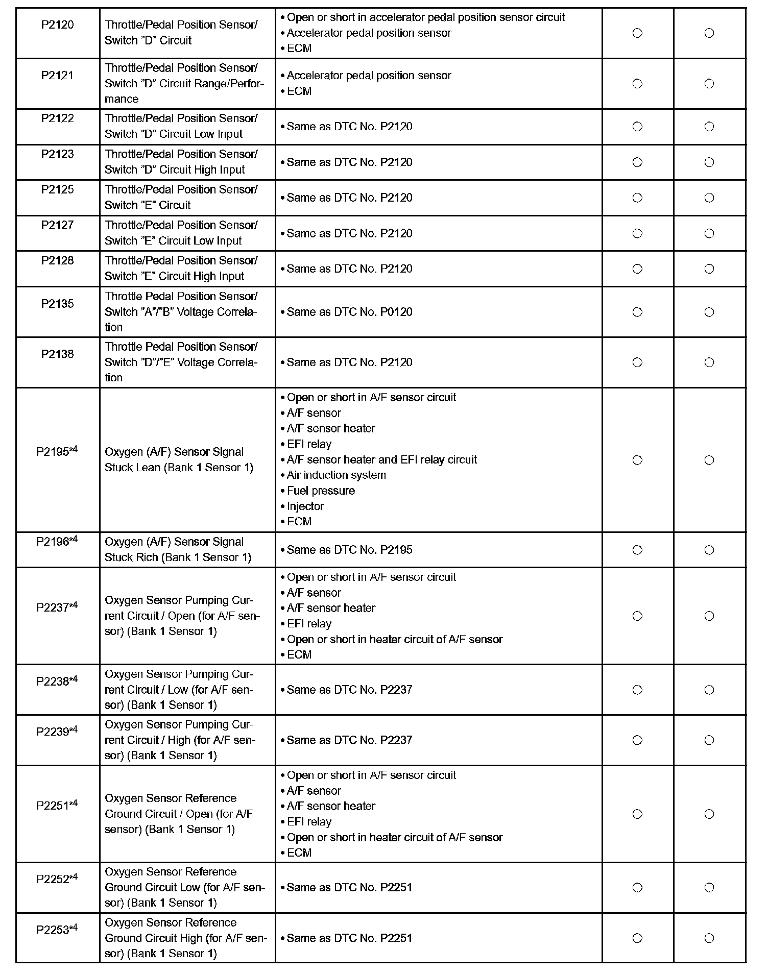 HINT: Parameters listed in the chart may be different than your readings depending on the type of instrument used and other factors. During the DTC check, refer to the table if a malfunction code is displayed. For details about each code, refer to the DTC chart's.
