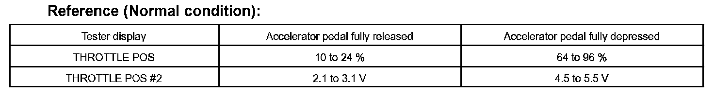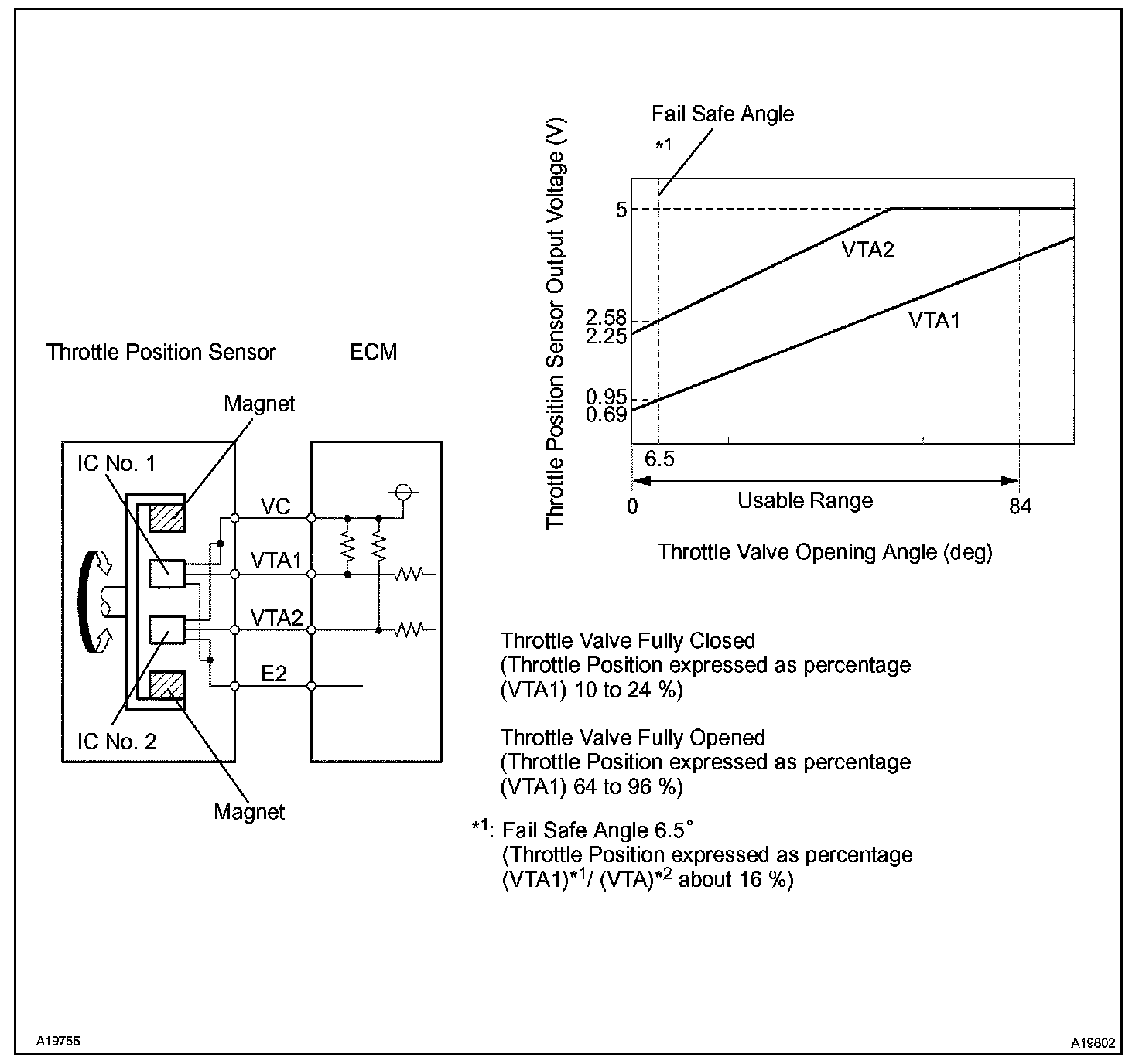 The voltage applied to terminals VTA and VTA2 of the ECM changes between 0 V and 5 V in proportion to the opening angle of the throttle valve. The VTA is a signal to indicate the actual throttle valve opening angle which is used for the engine control, and the VTA2 is a signal to indicate the information about the opening angle which is used for detecting a malfunction.