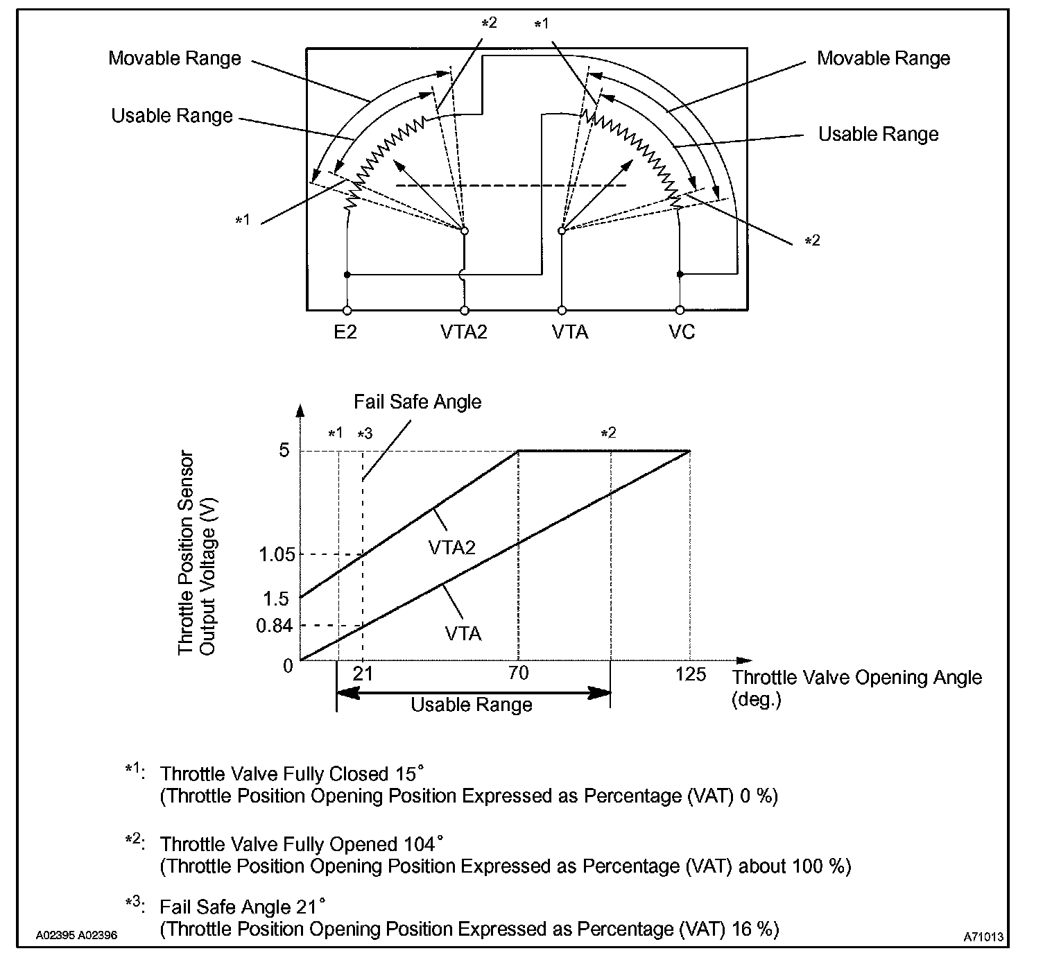 The ECM uses the throttle position sensor to monitor the throttle valve opening angle. This sensor includes 2 signals: VTA1*1/VTA*2 and VTA2. VTA1*1/VTA*2 is used to detect the throttle opening angle and VTA2 is used to detect malfunctions in VTA1*1/VTA*2. There are several checks that the ECM performs confirm proper operation of the throttle position sensor and VTA1*1/VTA*2.