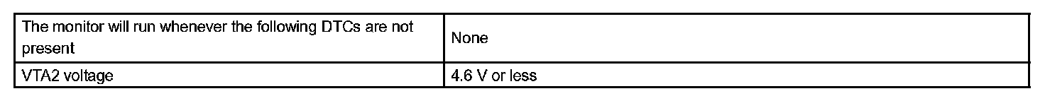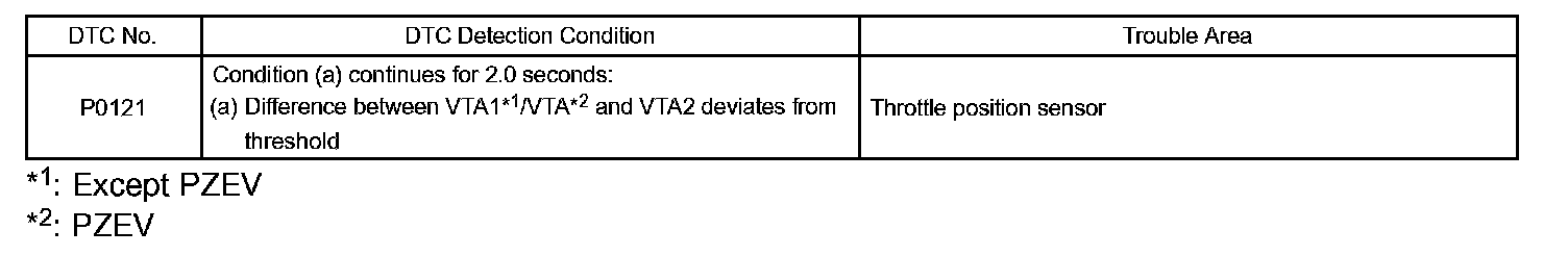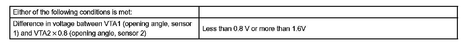 If the voltage output difference of the VTA1*1/VTA*2 and VTA2 deviates from the normal operating range, the ECM interprets this as a malfunction of the throttle position sensor. The ECM will turn on the MIL and a DTC is set.