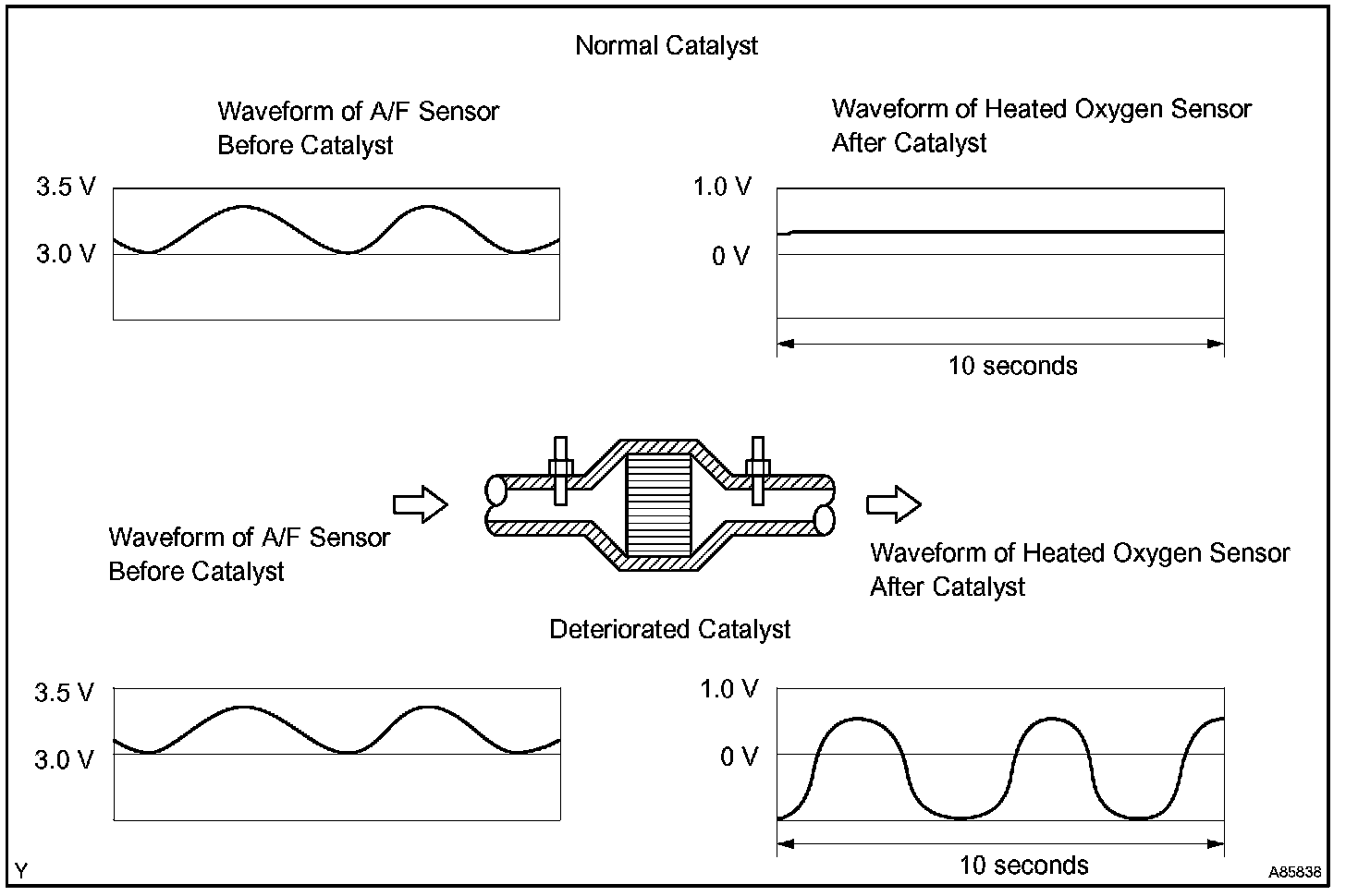 The ECM uses sensors mounted before and after the three-way catalyst (TWC) to monitor its' efficiency. The first sensor, an Air Fuel ratio (A/F) sensor, sends pre-catalyst A/F ratio information to the ECM. The second