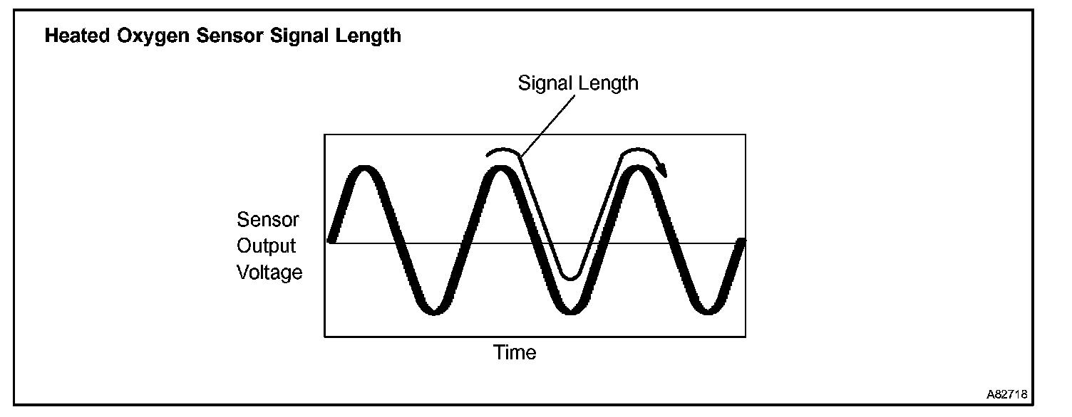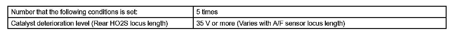 If the catalyst is functioning normally, the waveform of the heated oxygen sensor slowly switches between RICH and LEAN. If the catalyst is deteriorated, the waveform will alternate frequently between RICH and LEAN. As the catalyst efficiency degrades, its ability to store oxygen is reduced and the catalyst output becomes more variable. When running the monitor, the ECM compares sensor 1 signals (A/F sensor) over a specific amount of time to determine catalyst efficiency. The ECM begins by calculating the signal length for both sensors (for the rear oxygen sensor, the ECM uses the output voltage signal length). If the oxygen sensor output voltage signal length is greater than the threshold (threshold is calculated based on the A/F sensor signal length), the ECM concludes that the catalyst is malfunctioning. The ECM will turn on the MIL and a DTC will be set.