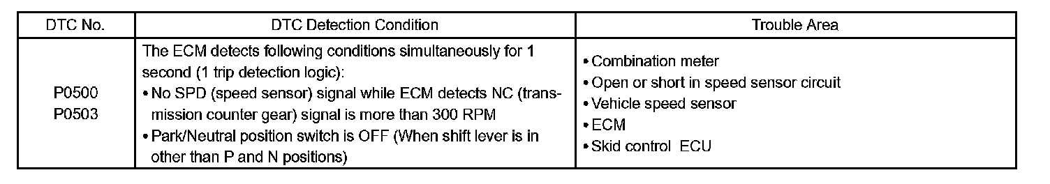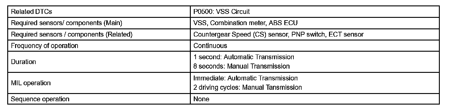 The ECM assumes that the vehicle is being driven when the transmission counter gear indicates more than 300 rpm and over 30 seconds have passed since the park/neutral position switch was turned OFF. If there is no signal from the vehicle speed sensor with these conditions satisfied, the ECM concludes that the vehicle speed sensor is malfunctioning. The ECM will turn on the MIL and a DTC is set.
