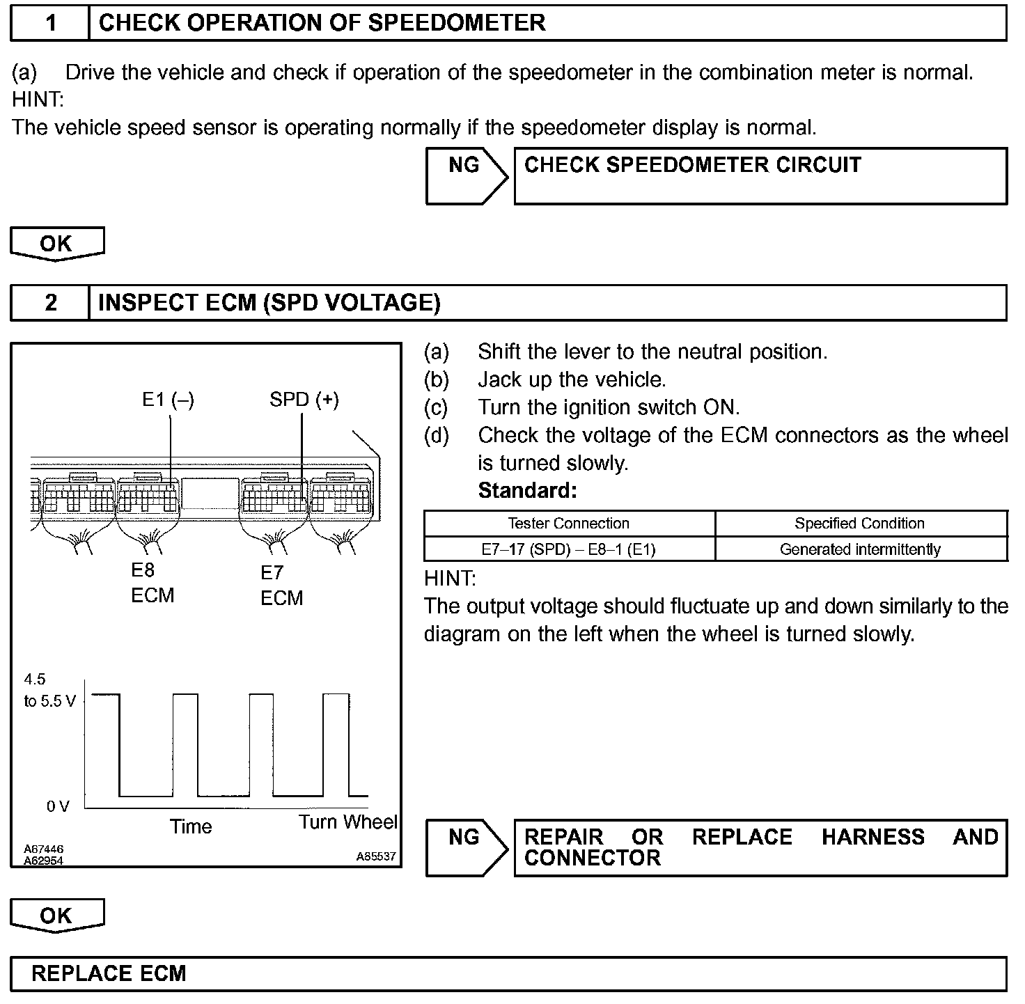 The speed sensor detects the wheel speed and sends the appropriate signals to the skid control ECU. The skid control ECU converts these wheel speed signals into a 4-pulse signal and outputs it to the ECM via the combination meter. The ECM determines the vehicle speed based on the frequency of these pulse signals.