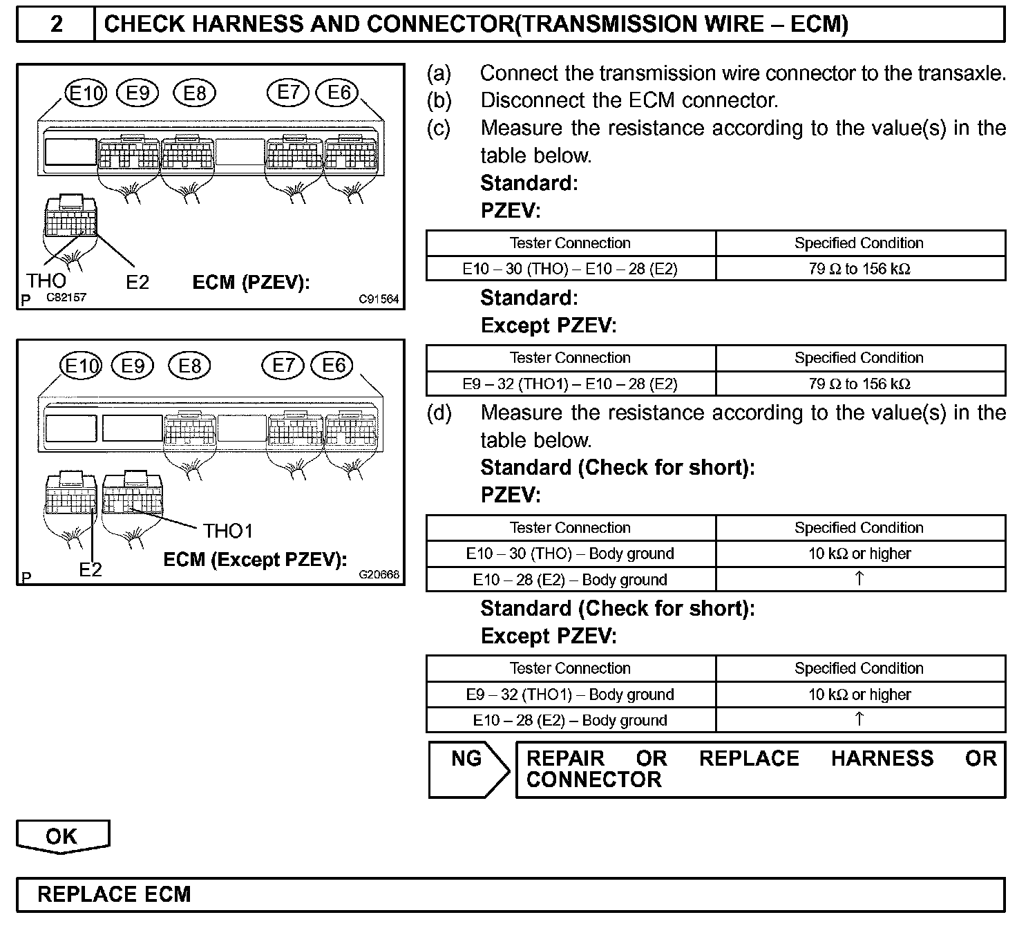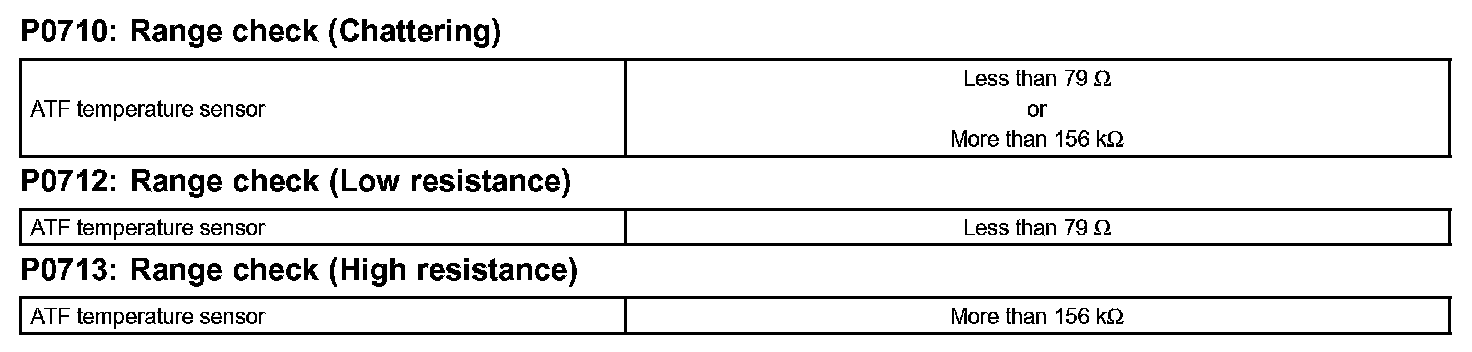 The automatic transmission fluid (ATF) temperature sensor converts ATF temperature to an electrical resistance value. Based on the resistance, the ECM determines the ATF temperature, and the ECM detects an opens or shorts in the ATF temperature circuit. If the resistance value of the ATF temperature is less than 79 Ohms *1 or more than 156 kOhms *2, the ECM interprets this as a fault in the ATF sensor or wiring. The ECM will turn on the MIL and store the DTC.