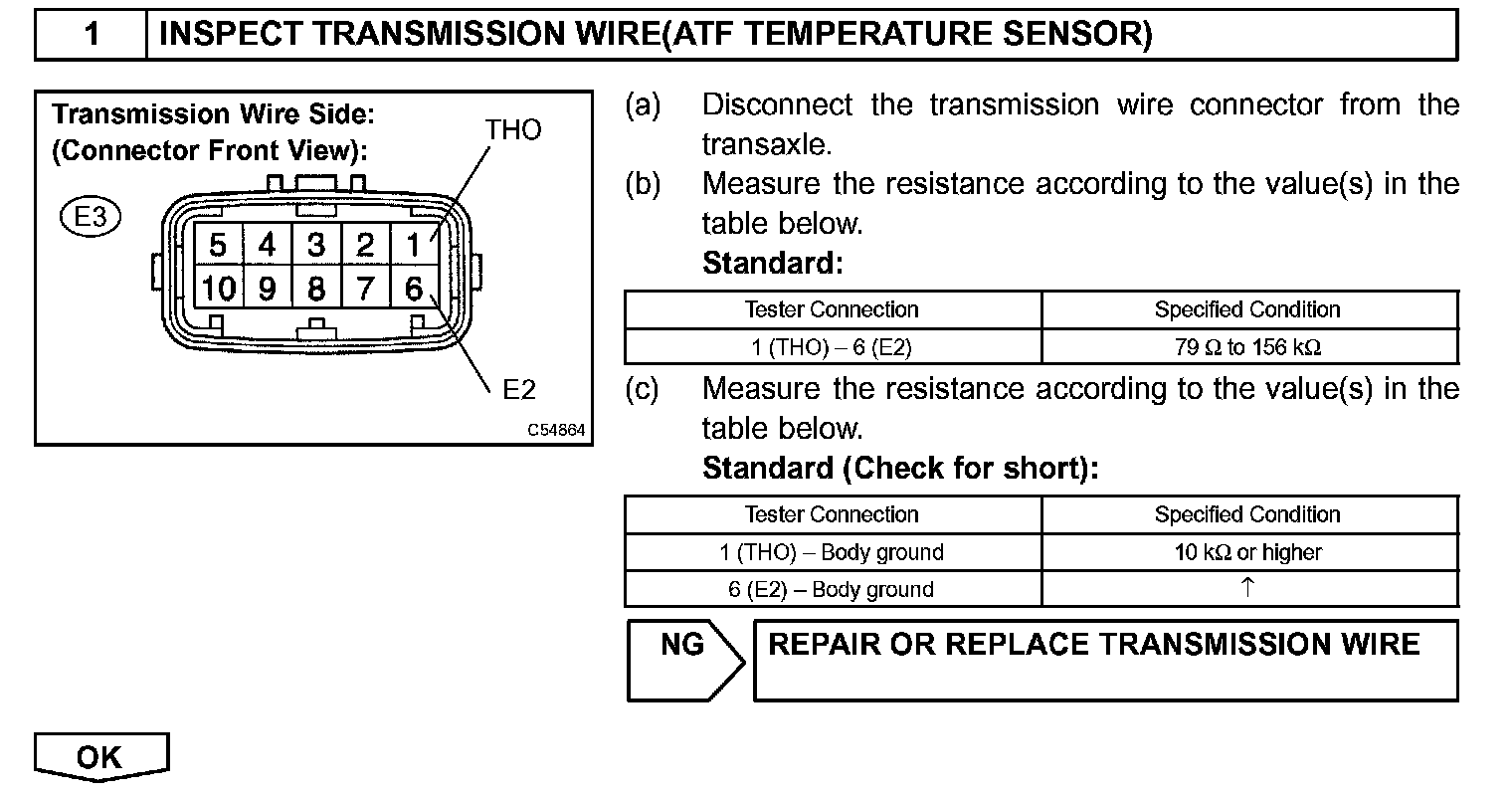 The sensor resistance changes with the transmission fluid temperature. As the temperature becomes higher, the sensor resistance decreases.