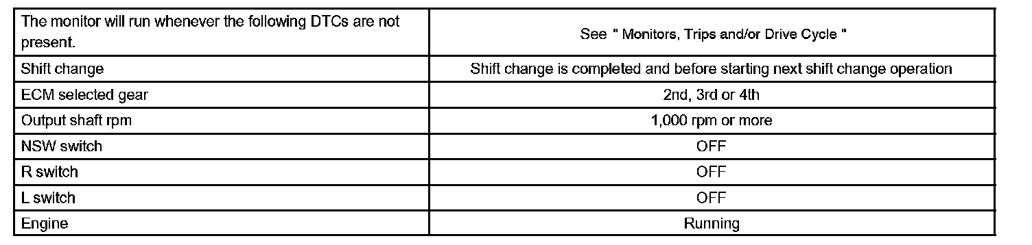 While the vehicle is operating in the 2nd, 3rd or O/D gear position in the shift position of D, if the input shaft revolution is less than 300 rpm *1 although the output shaft revolution is more than 1,000 rpm *2, the ECM detects the trouble, illuminates the MIL and stores the DTC.