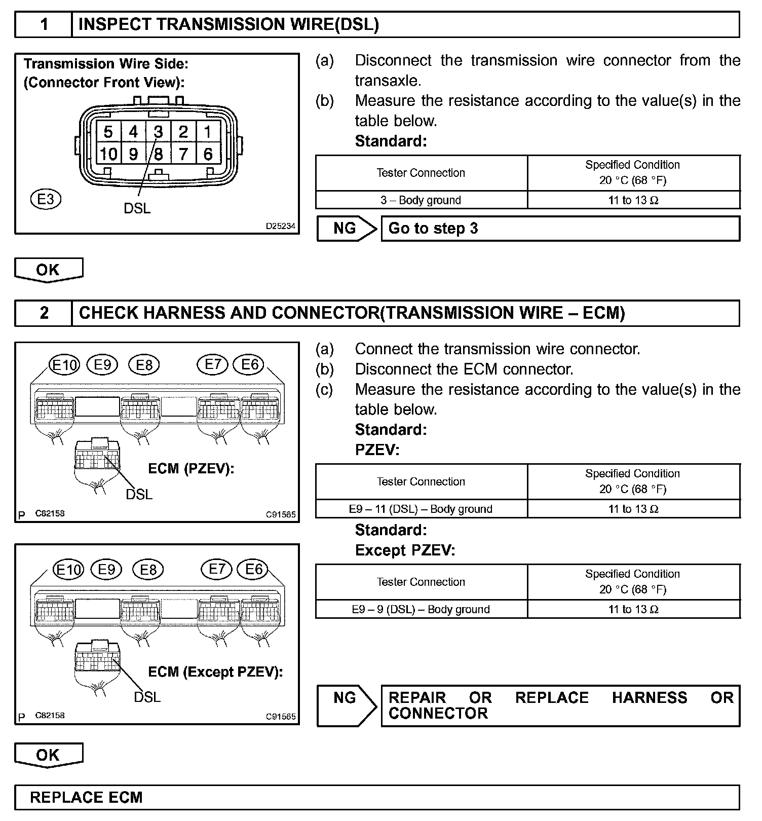 Torque converter lock-up is controlled by the ECM based on engine rpm, engine load, engine temperature, vehicle speed, transmission temperature, and shift range selection. The ECM determines the lock-up status of the torque converter by comparing the engine rpm (NE) to the input turbine rpm (NT). The ECM calculates the actual transmission gear by comparing input turbine rpm (NT) to counter gear rpm (NC). When conditions are appropriate, the ECM requests "lock-up" by applying control voltage to shift solenoid DSL. When the DSL is opened, solenoid DSL applies pressure to the lock-up relay valve and locks the torque converter clutch. If the ECM detects an open or short in the DSL solenoid circuit, the ECM interprets this as a fault in the DSL solenoid or circuit. The ECM will turn on the MIL and store the DTC.