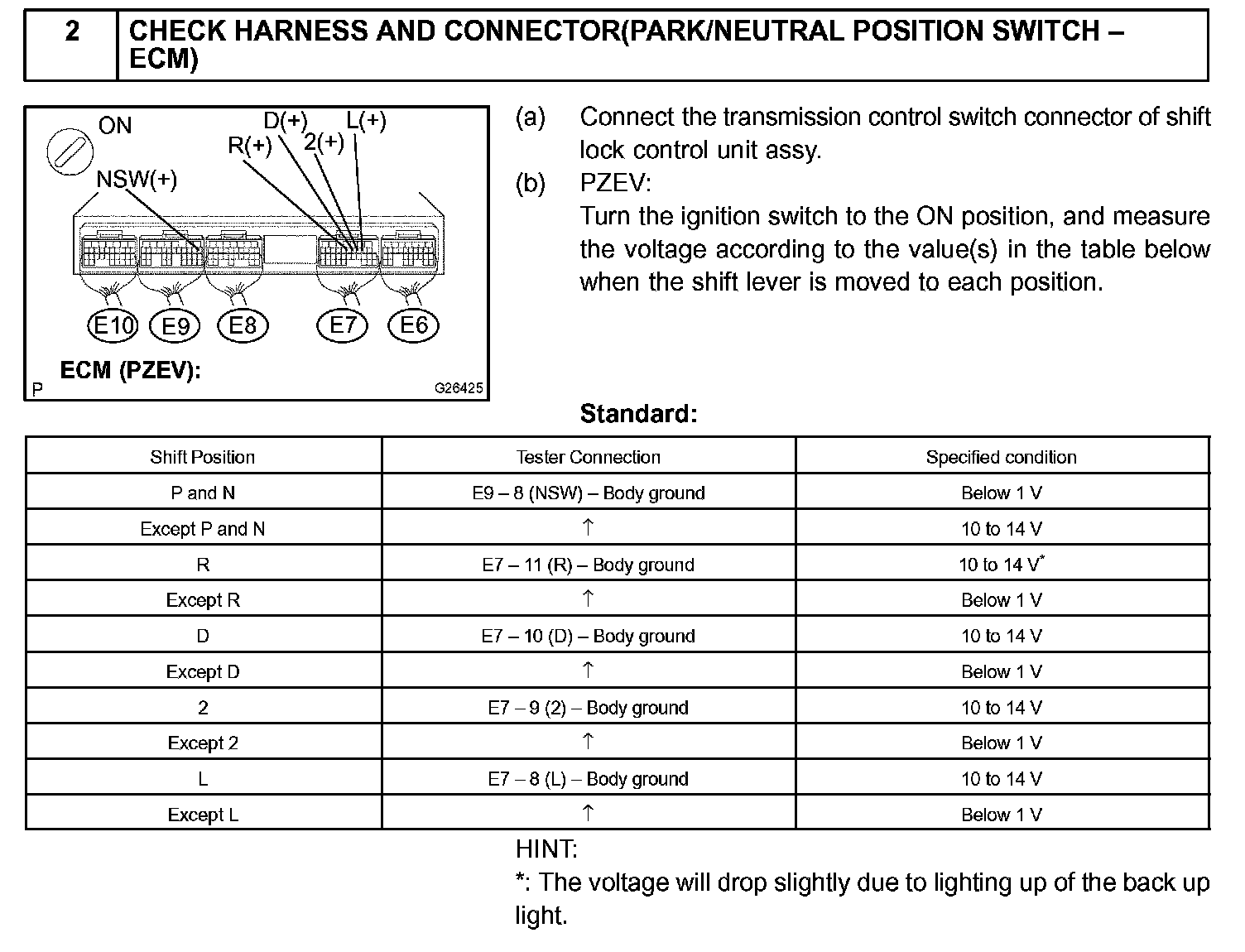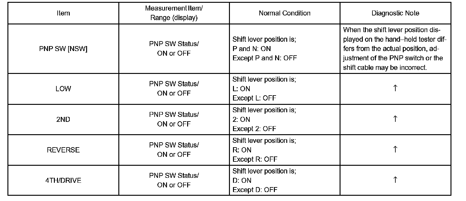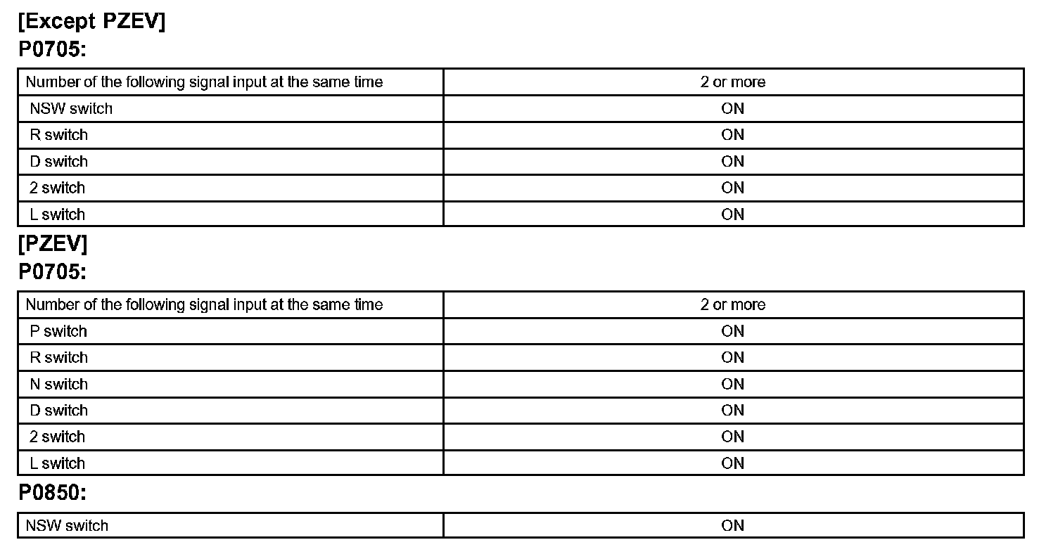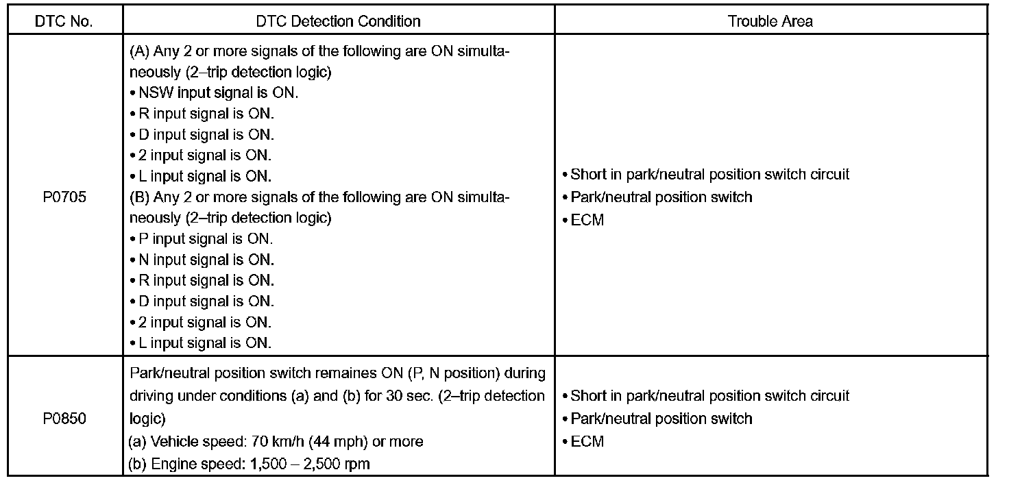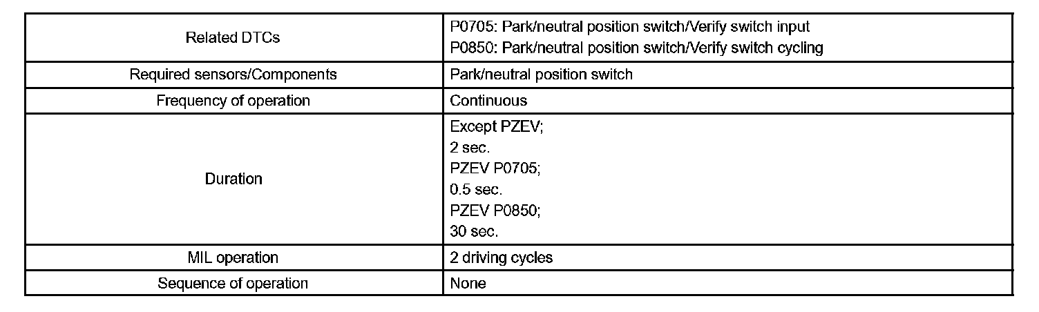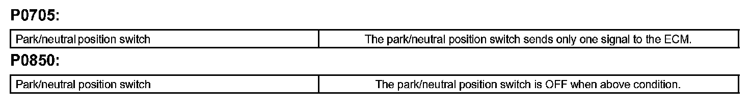 When the park/neutral position switch sends more than one signal at a time from switch positions P, R, N, D, 2 or L, the ECM interprets this as a fault in the switch. The ECM will turn on the MIL and store the DTC.