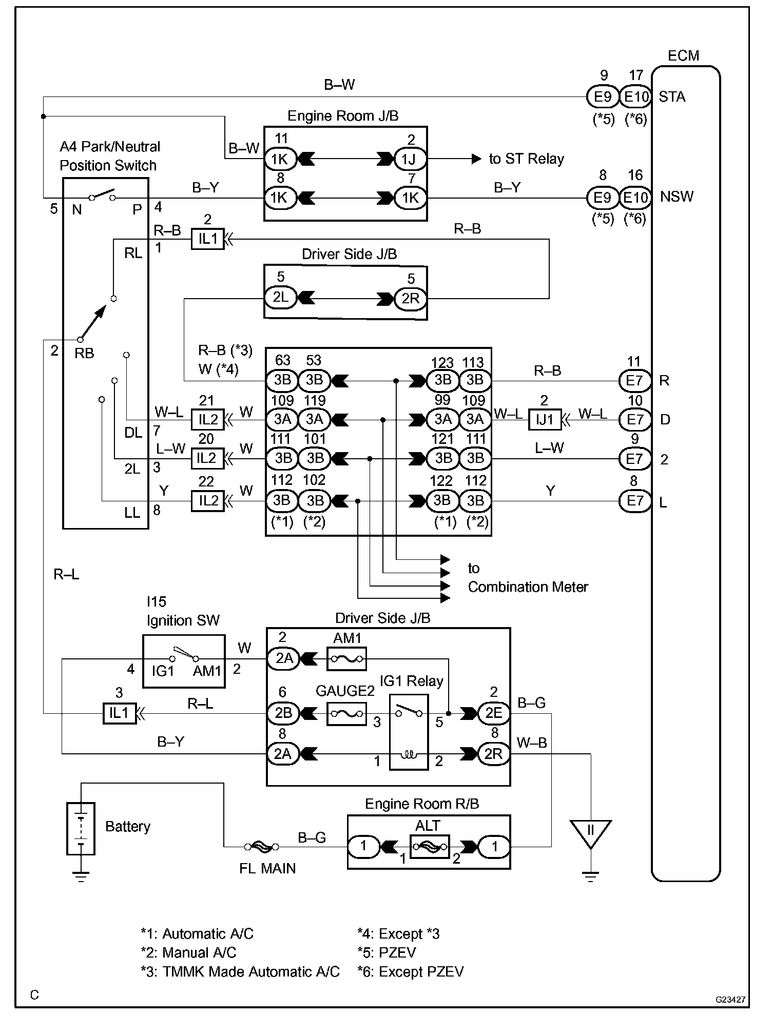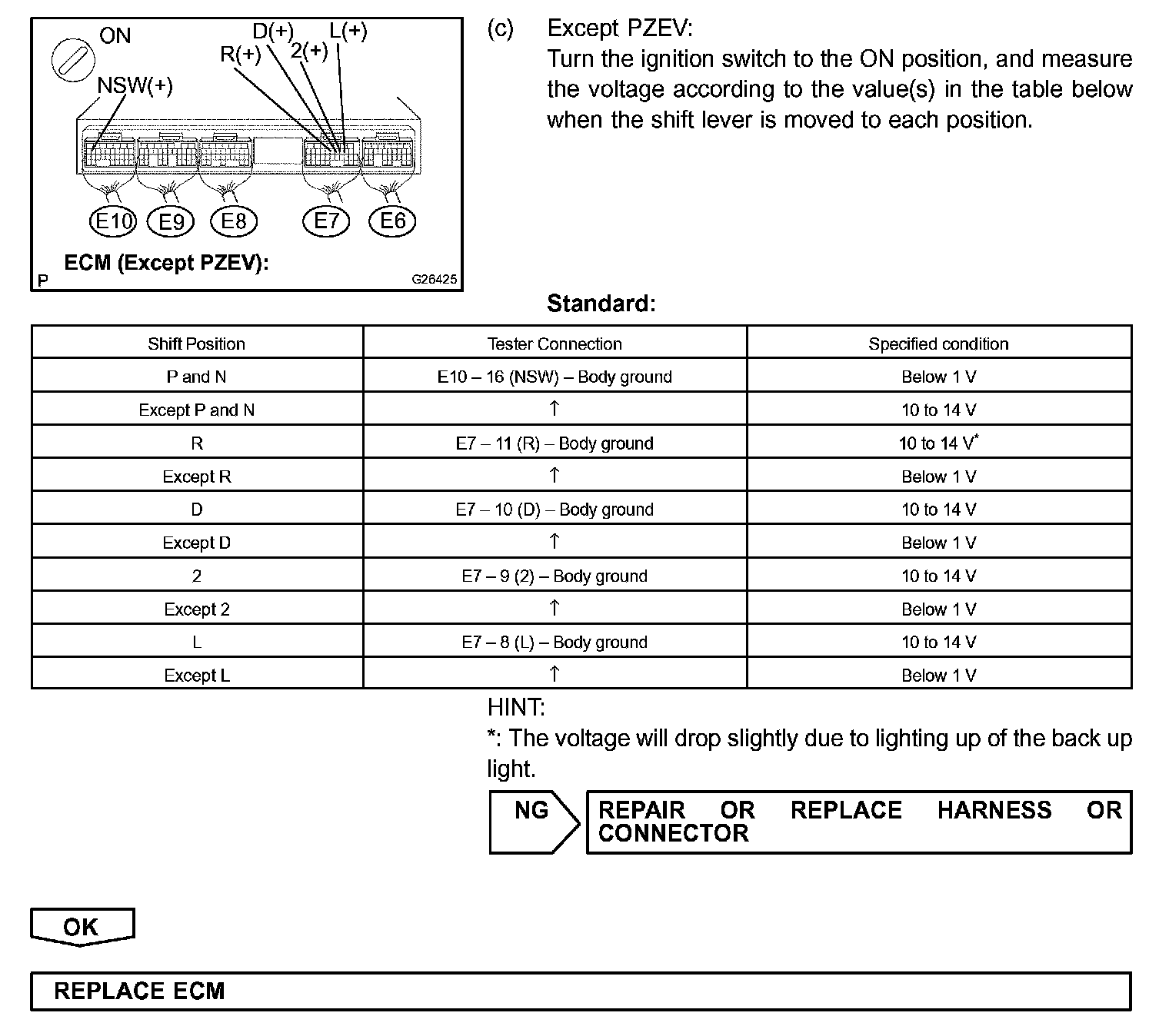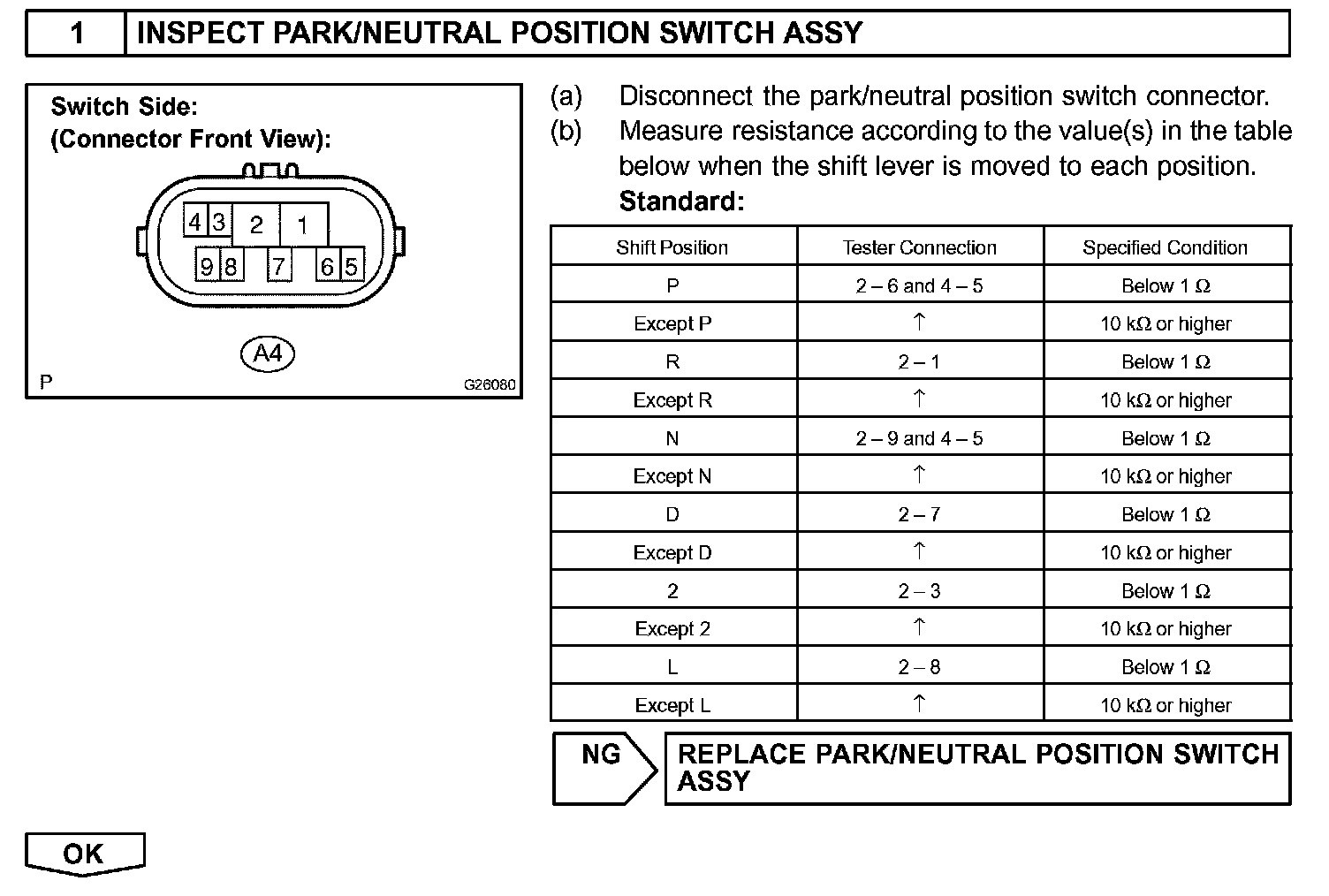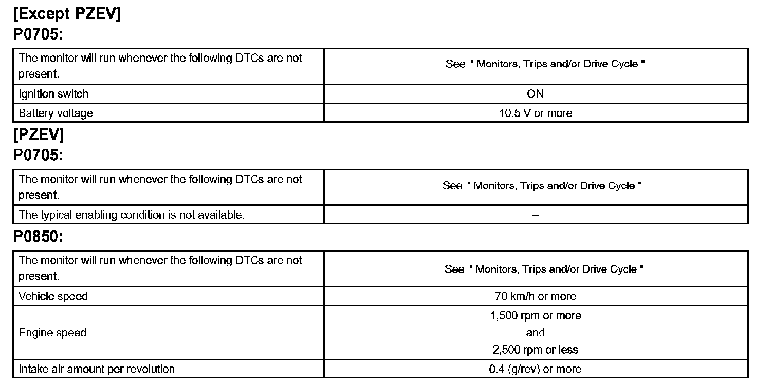 When the park/neutral position switch sends more than one signal at a time from switch positions P, R, N, D, 2 or L, the ECM interprets this as a fault in the switch. The ECM will turn on the MIL and store the DTC.