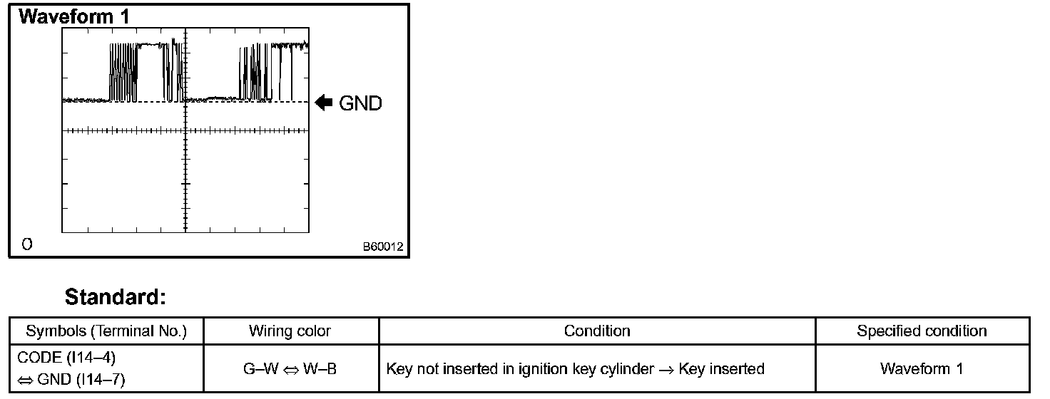 e. Set the oscilloscope at 5 V/DIV and 10 ms/DIV, and insert the key in the ignition key cylinder. Check the waveform 2 between the terminal I14-3 and I14-7 of the transponder key amplifier.