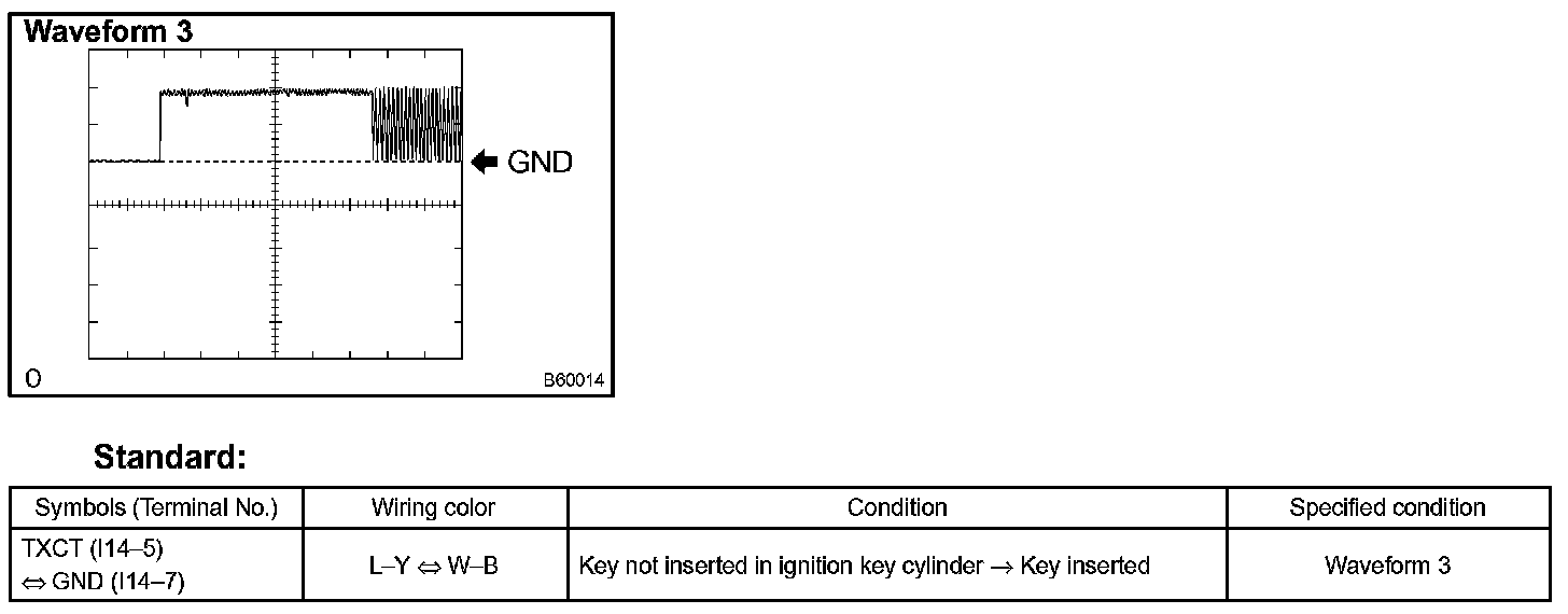 f. Set the oscilloscope at 2 V/DIV and 10 ms/DIV, and insert the key in the ignition key cylinder. Check the waveform 3 between the terminal I14-5 and I14-7 of the transponder key amplifier.
