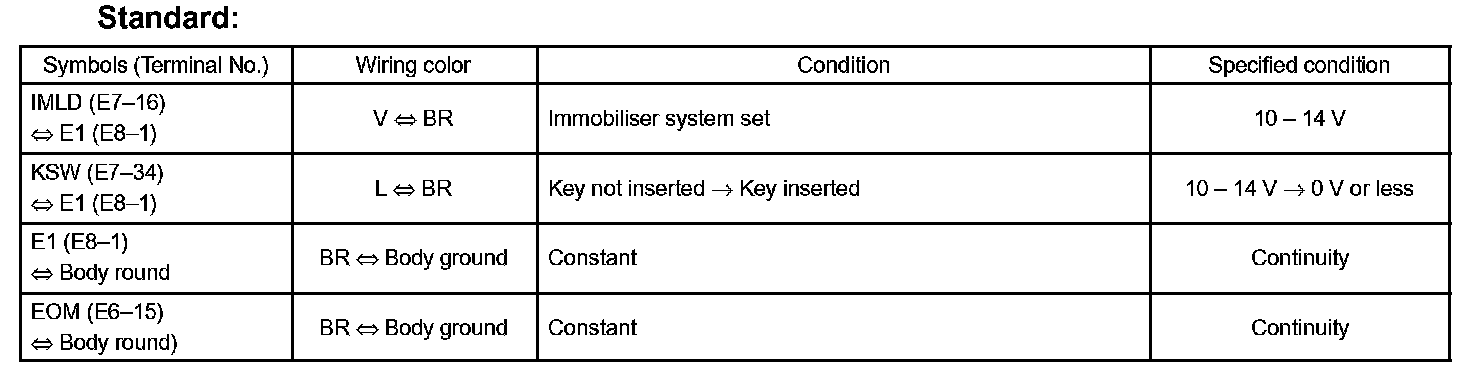 - Inspect the power source voltage (ignition switch ON: 10 - 14 V) and the body ground (ignition switch OFF: below 5 Ohms (each ground terminal <=> engine ground, body ground)) before the check.