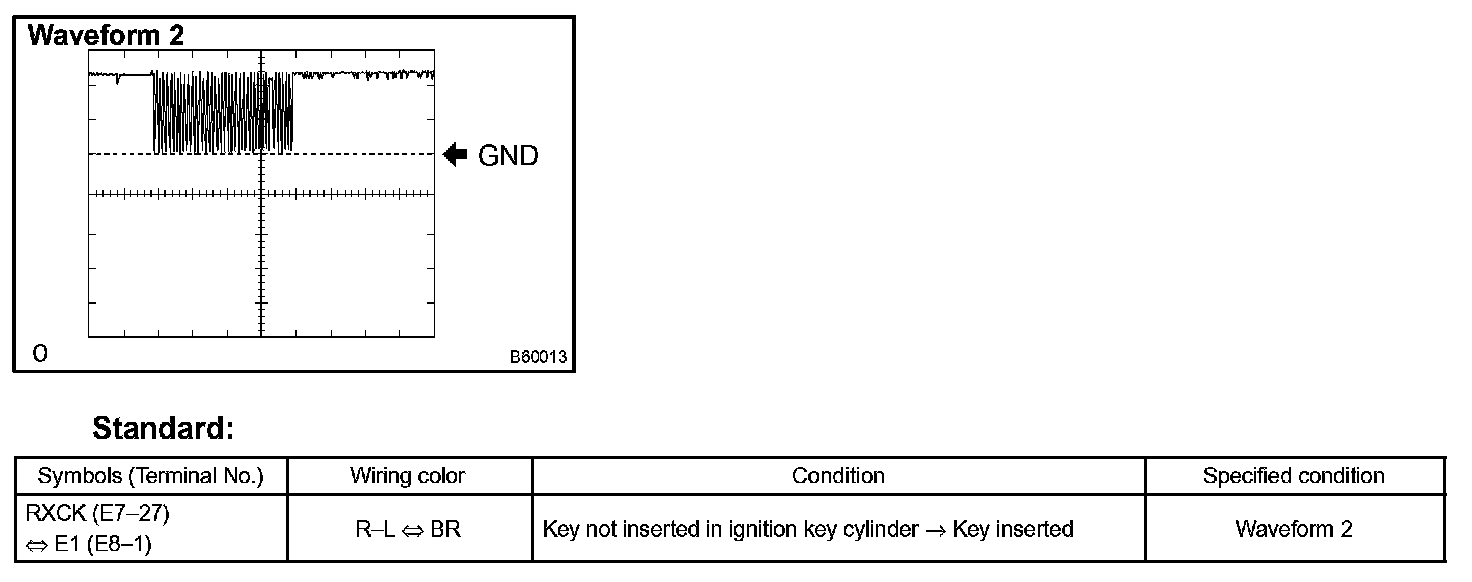d. Set the oscilloscope at 5 V/DIV and 10 ms/DIV, and insert the key in the ignition key cylinder. Check the waveform 2 between the terminal E7-27 and E8-1 of the ECM.