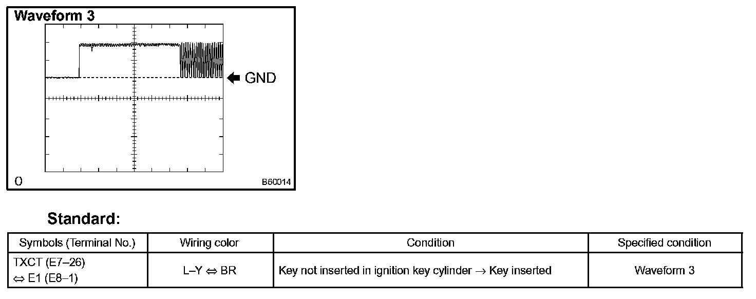 e. Set the oscilloscope at 2 V/DIV and 10 ms/DIV, and insert the key in the ignition key cylinder. Check the waveform 3 between the terminal E7-26 and E8-1 of the ECM.