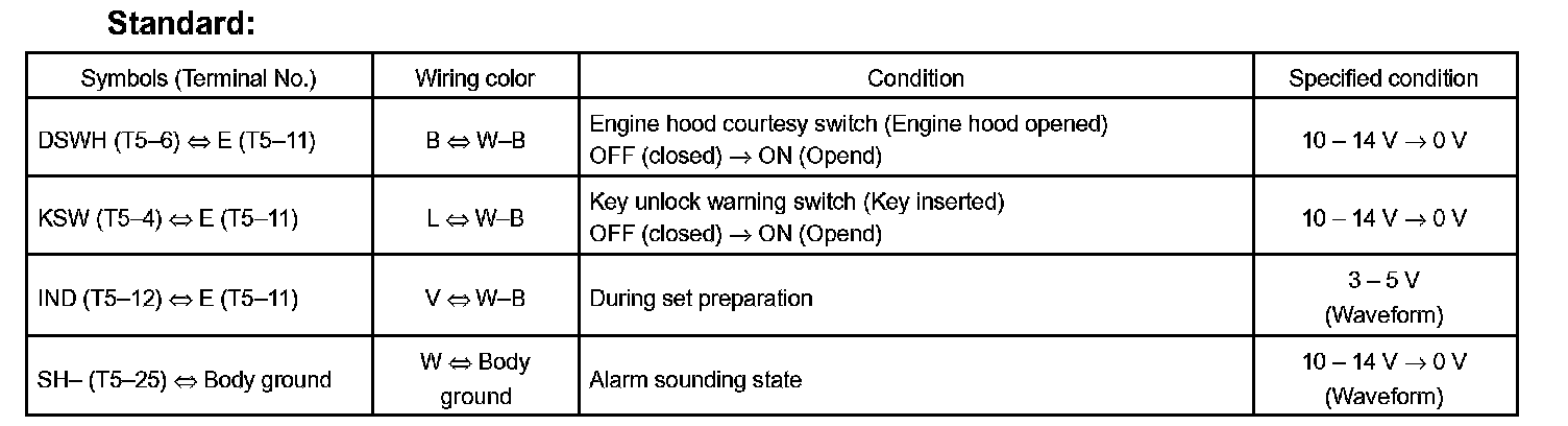 a. Disconnect the T6 theft warning ECU connector, and check the voltage and continuity of each terminal of the wire harness side connector.