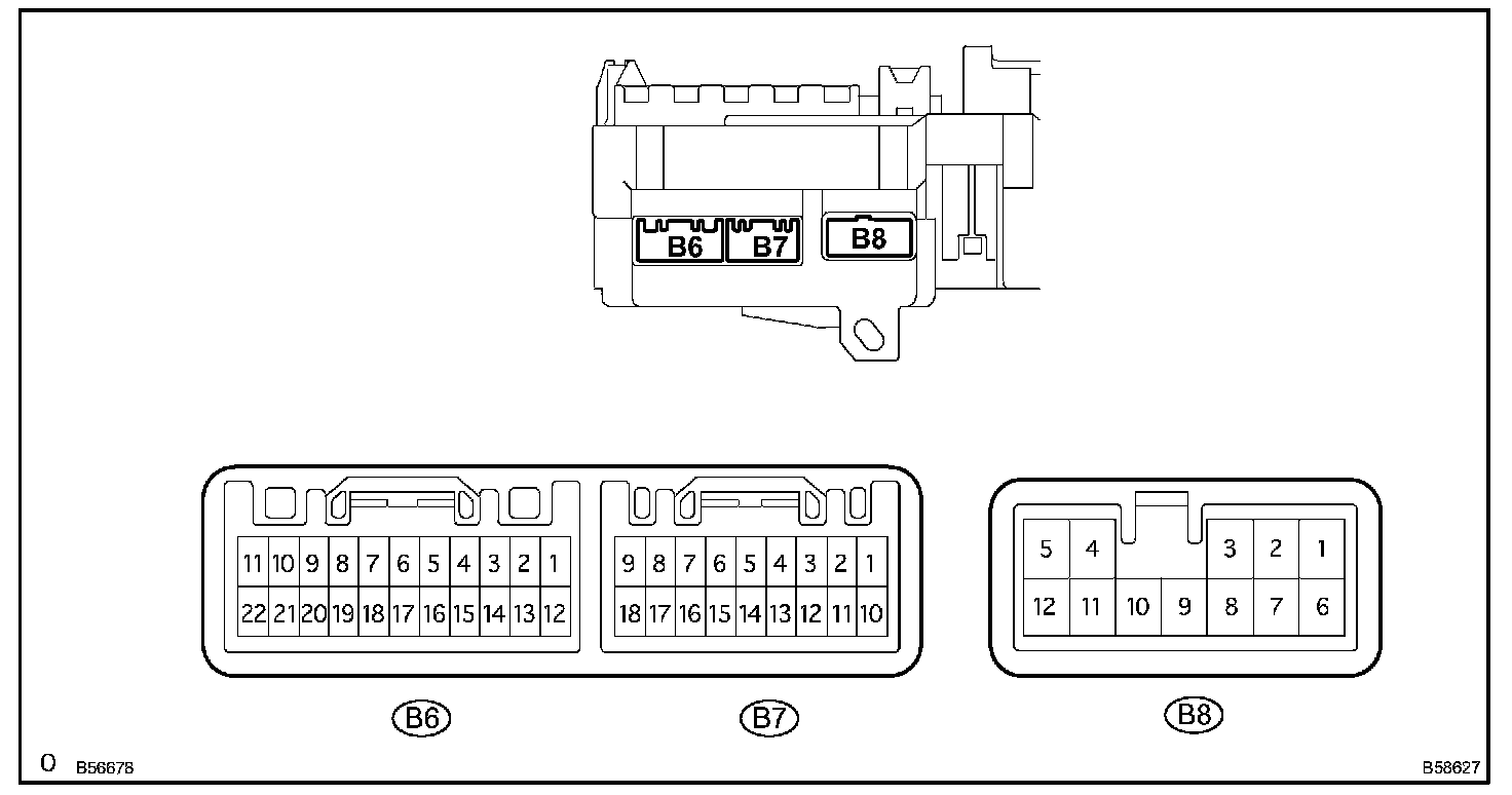 a. Disconnect the B7 and B8 body ECU connector, and check the voltage of each terminal of the wire harness side connector.