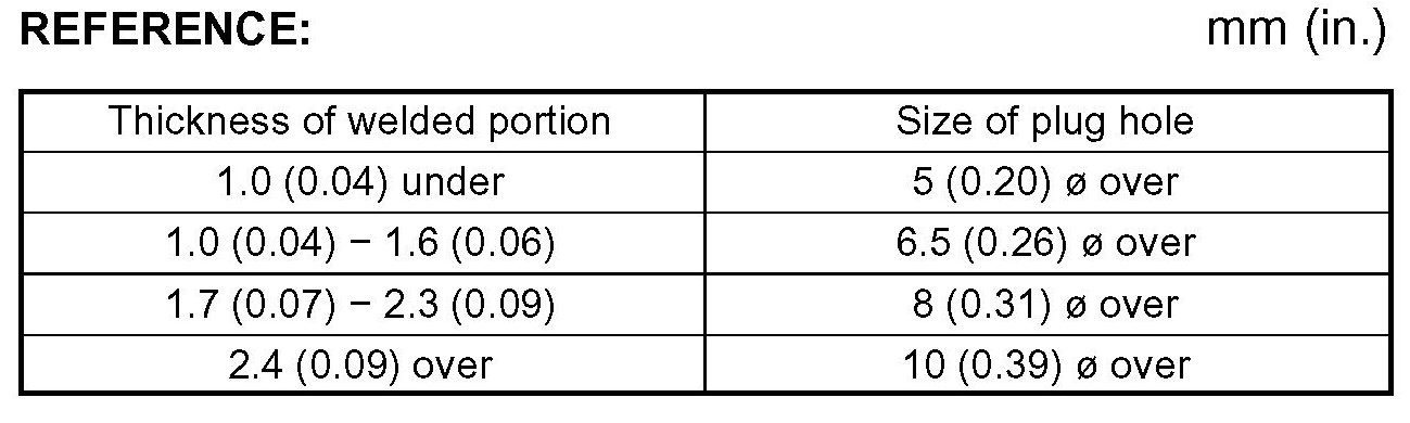 1. When welding panels with a combined thickness of over 3 mm (0.12 in.), use a MIG (Metal Inert Gas) welder for plug welding.