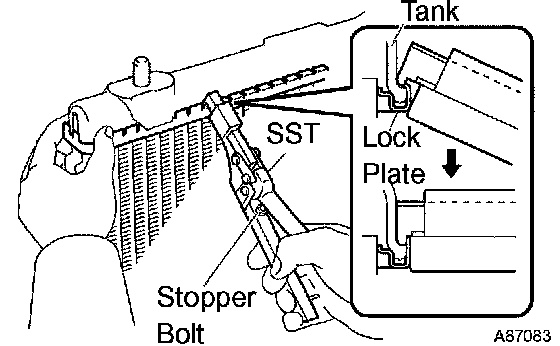 a) Lightly tap the bracket of the radiator (or radiator hose inlet or outlet) with a soft-faced hammer, and remove the tank.