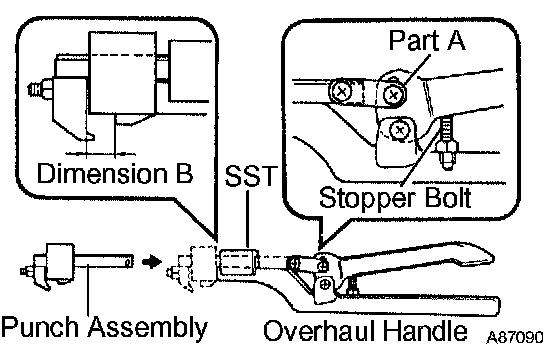 a) Install the punch assembly to the overhaul handle, inserting it in the hole in part A as shown in the illustration.
