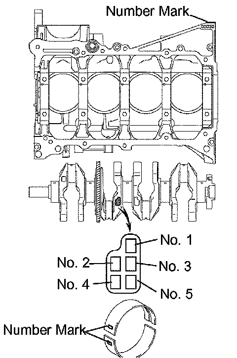 k) If using a standard bearing, replace it with one having the same number. If the number of the bearing cannot be determined, select the correct bearing by adding together the numbers imprinted on the cylinder block and crankshaft, and then selecting the bearing according to the chart. There are 4 sizes of standard bearings: 1, 2, 3 and 4