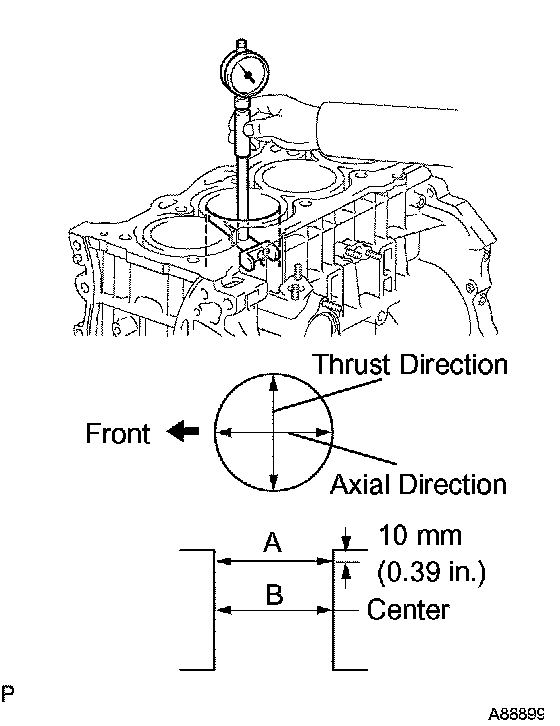 a) Using a cylinder gauge, measure the cylinder bore diameter at positions A and B in the thrust and axial directions.