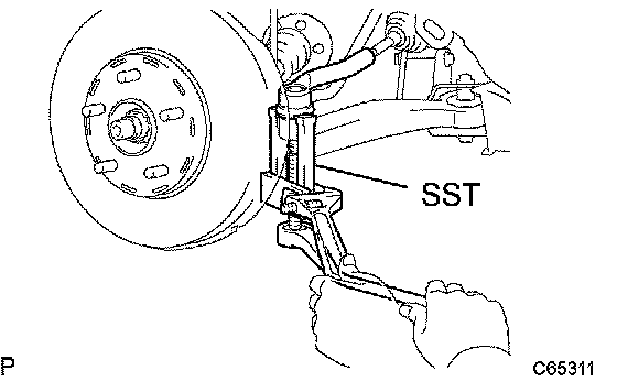 b) Using SST, disconnect the tie rod end from the steering knuckle.