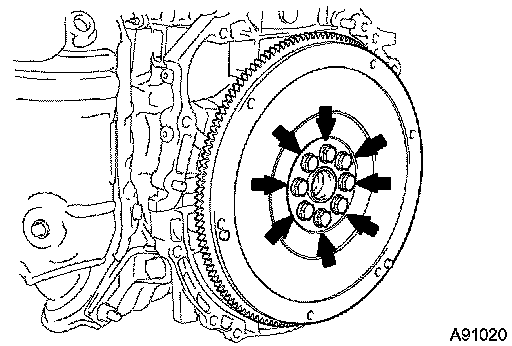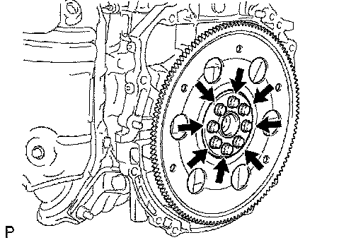 b) Remove the 8 bolts, rear spacer and flywheel.