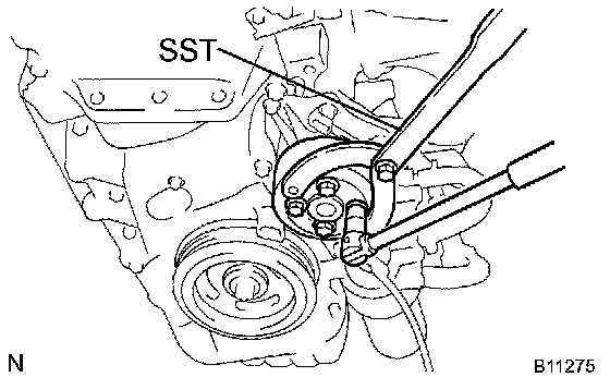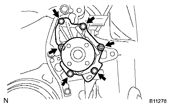 c) Install the water pump and bracket with the 4 bolts and 2 nuts.