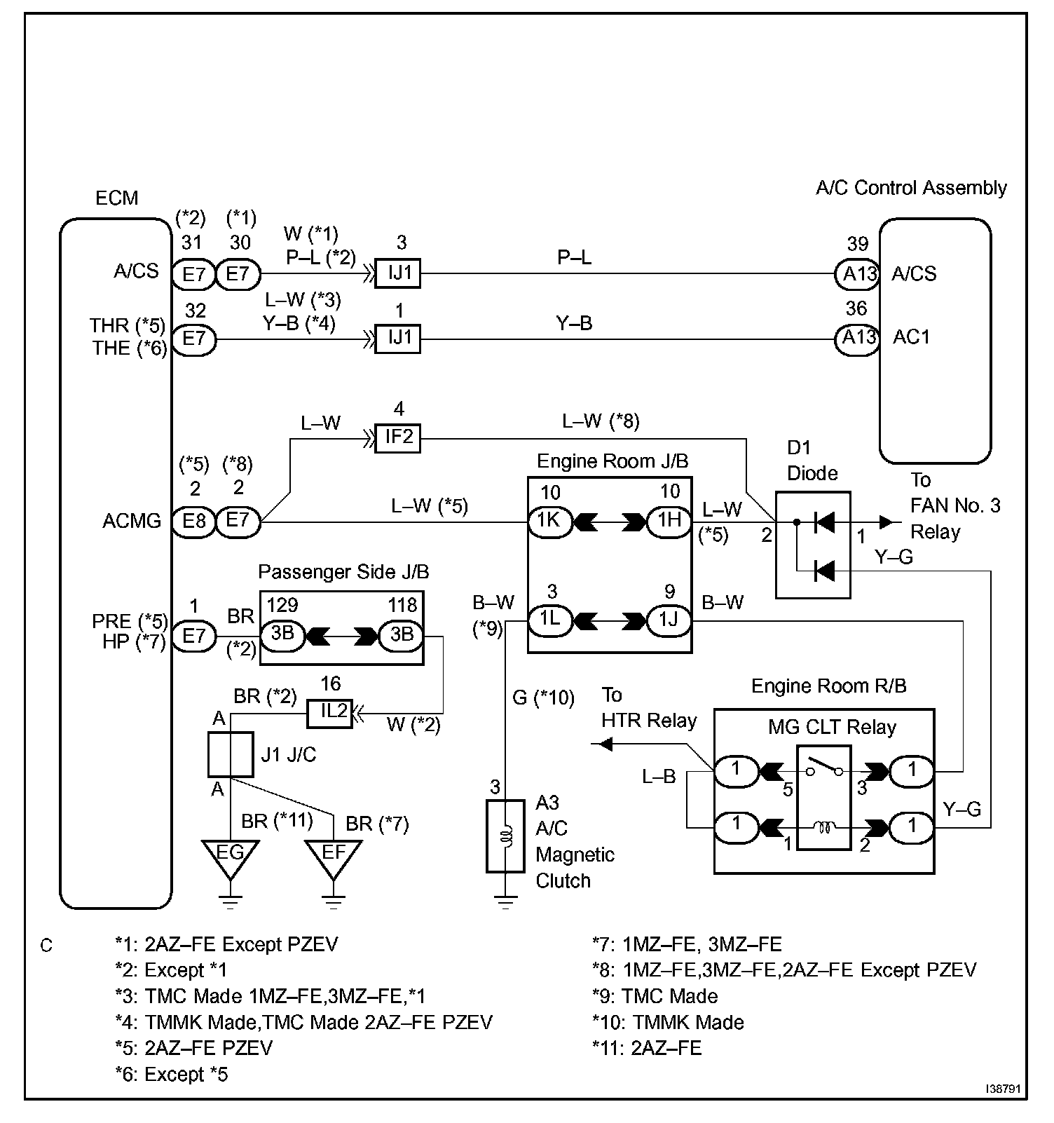 The A/C amplifier outputs the magnetic clutch ON signal from terminal AC1 to the ECM receives this signal, it sends a signal from terminal ACMG and switches the magnetic clutch relay ON, thus turning on the magnetic clutch.