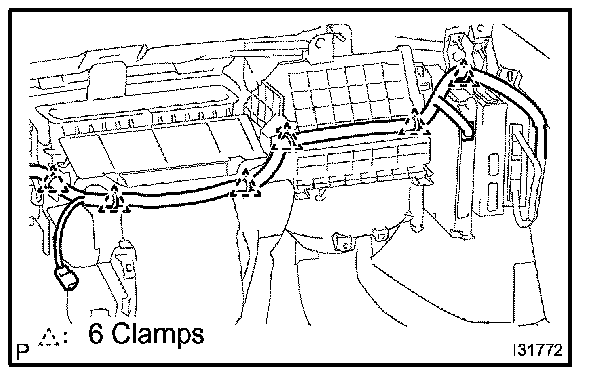 c. Disconnect the 6 clamps and the wire harness.