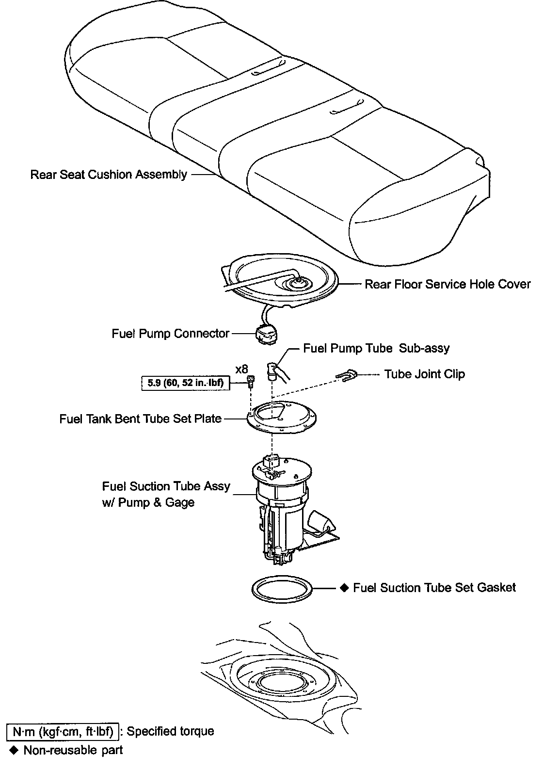The fuel filter is a part of the fuel pump assembly located underneath the rear seat cushion inside the fuel tank.