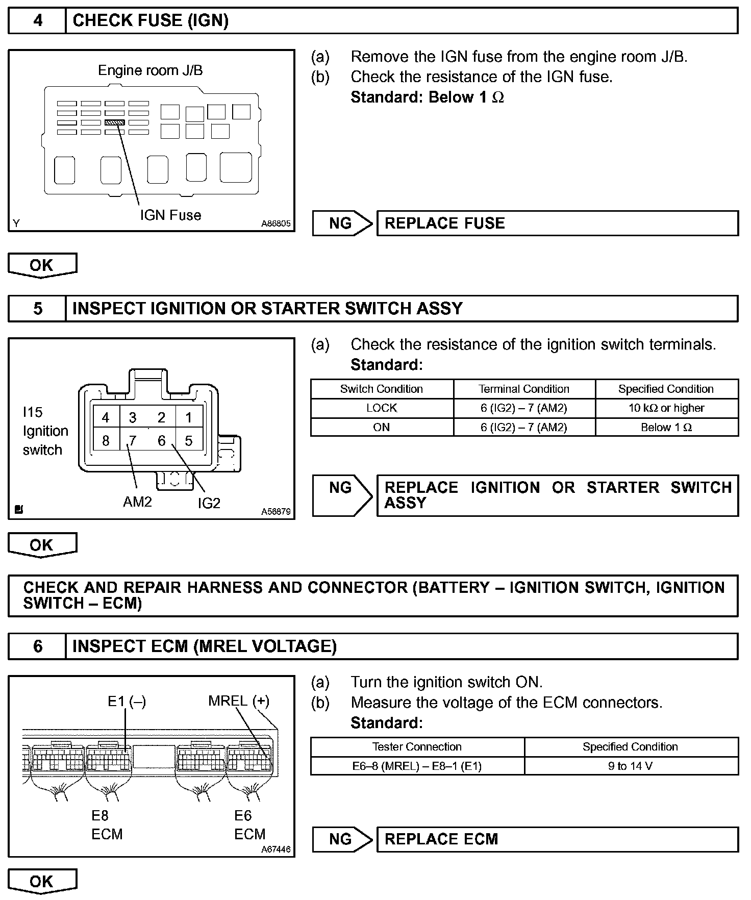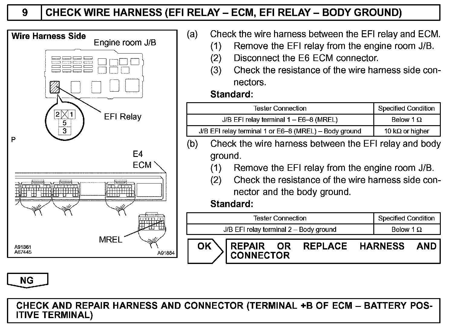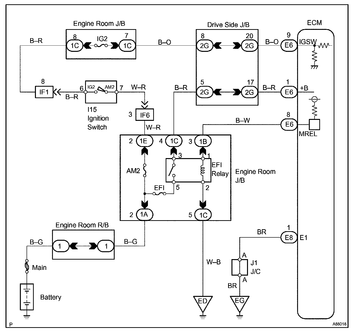 When the ignition switch is turned ON, battery voltage is applied to terminal IGSW of the ECM. The ECM "MREL" output signal causes current to flow to the coil, closing the contacts of the EFI relay (Marked: EFI) and supplying power to terminal +B of the ECM.