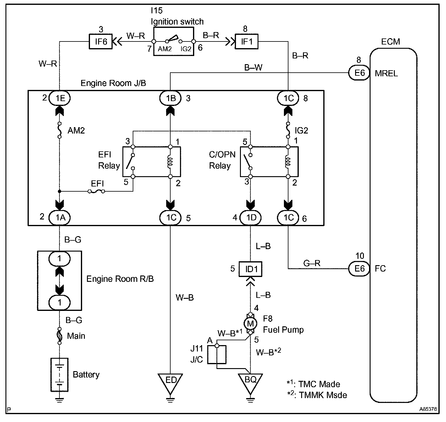 When the STA signal and NE signal are input to the ECM, Tr is turned ON, current flows to coil of the circuit opening relay (Marking: C/OPN), the relay switches on, power is supplied to the fuel pump and the fuel pump operates.