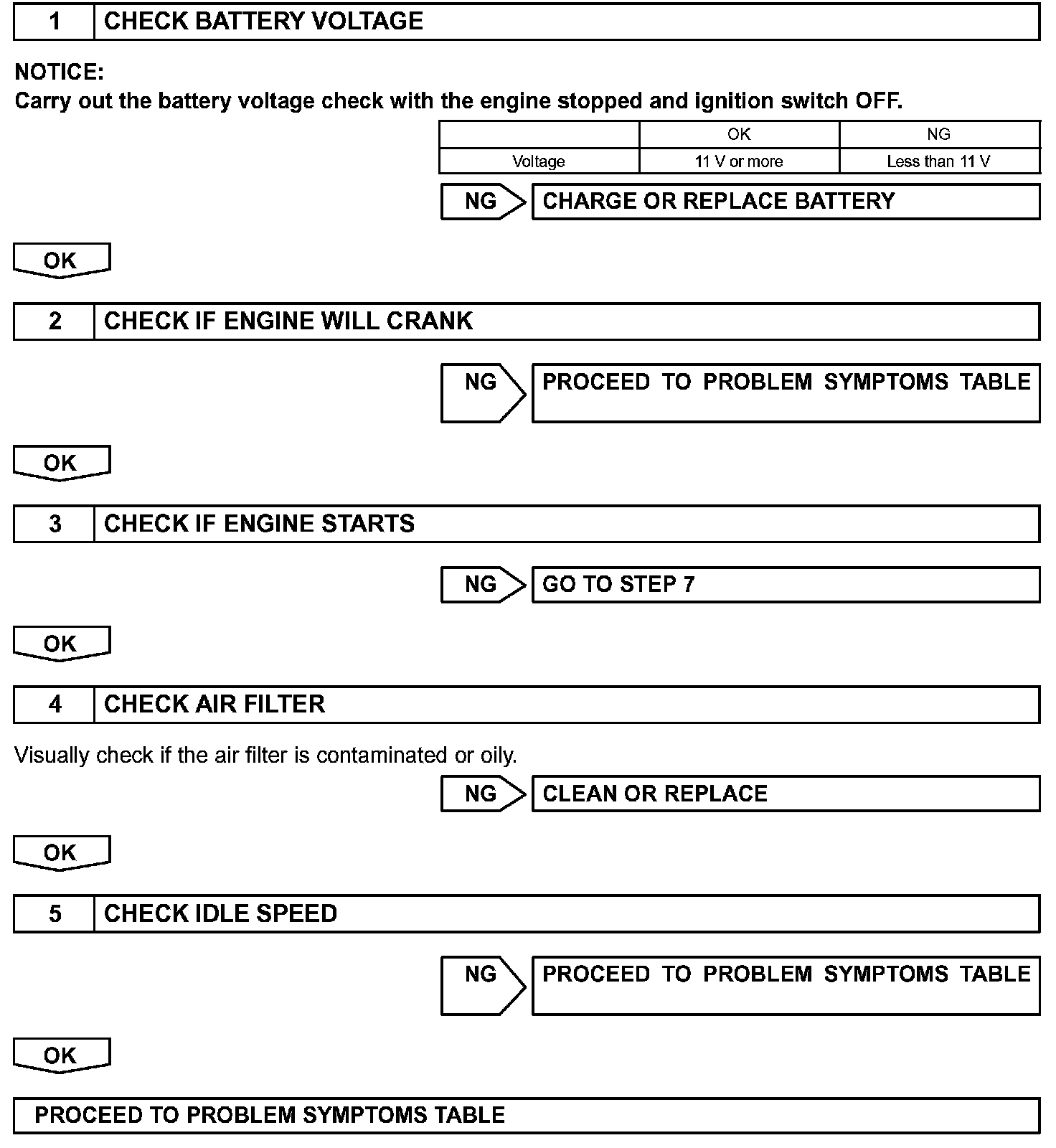 When the malfunction is not confirmed in the DTC check, troubleshooting should be carried out in all the possible circuits considered as possible causes of the problem. In many cases, by carrying out the basic engine check shown in the flowchart, the problem can be found quickly and efficiently. Therefore, using this check is essential in the engine troubleshooting.
