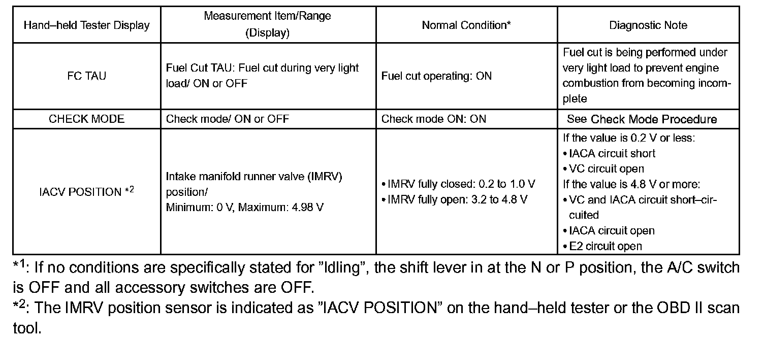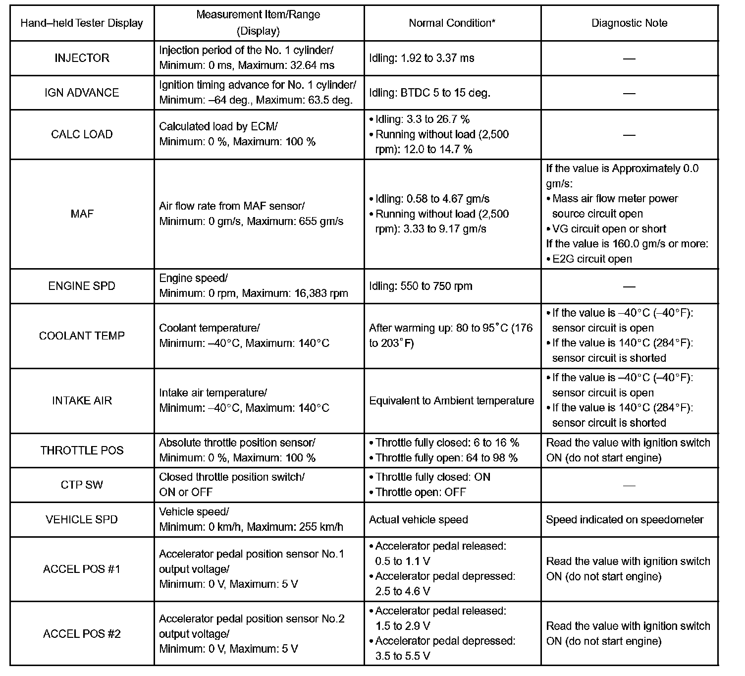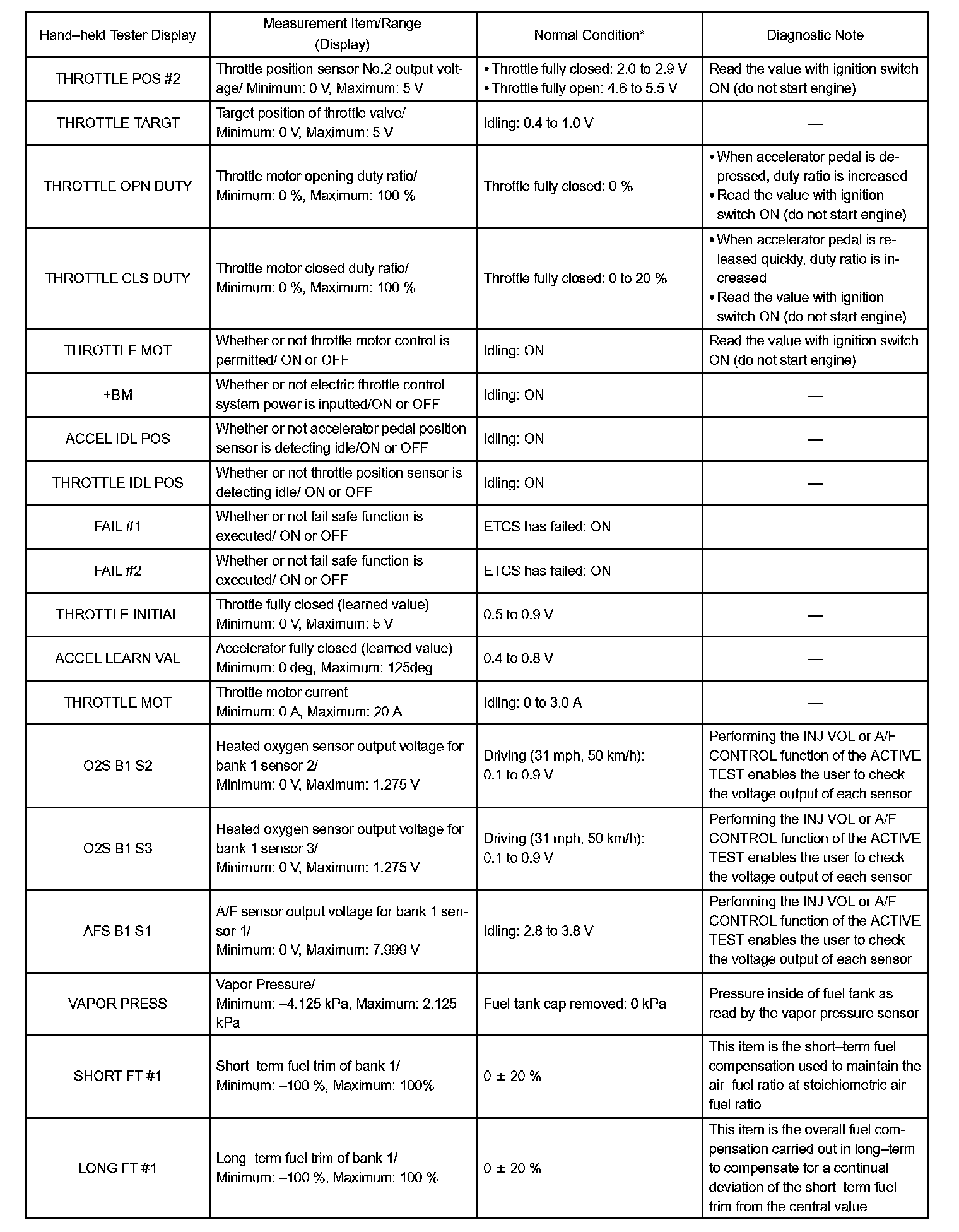 HINT: Using the hand-held tester DATA LIST allows switch, sensor, actuator and other item values to be read without removing any parts. Reading the DATA LIST early in troubleshooting is one way to shorten labor time.