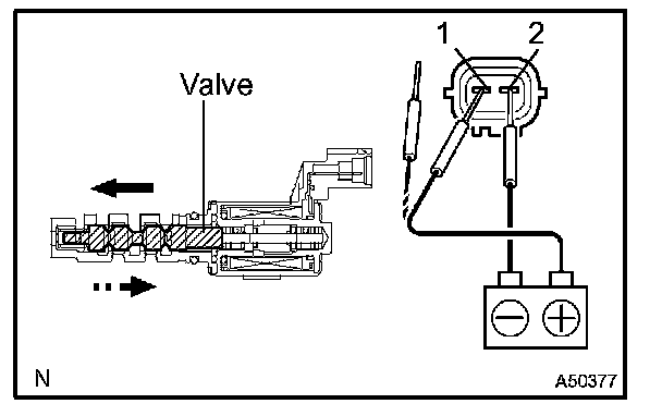 b. Connect the battery's positive (+) lead to terminal 1 and negative (-) lead to terminal 2, and check the movement of the valve.