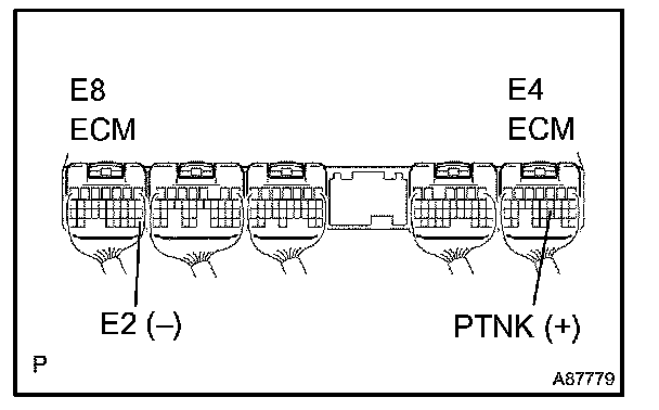 3. Using a voltmeter, measure the voltage between terminals E4-21 (PTNK) and E8-28 (E2) of the ECM connectors.
