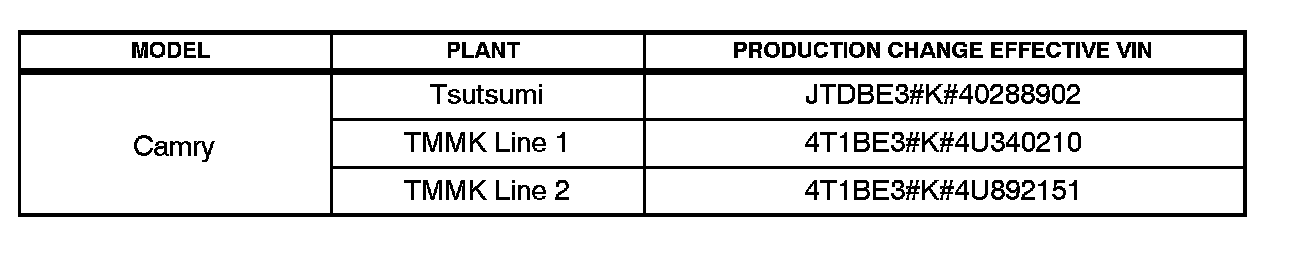 ^ 2004 model year Camry vehicles equipped with 2AZ-FE (4 Cylinder) PZEV engines produced BEFORE the Production Change Effective VINs shown below.